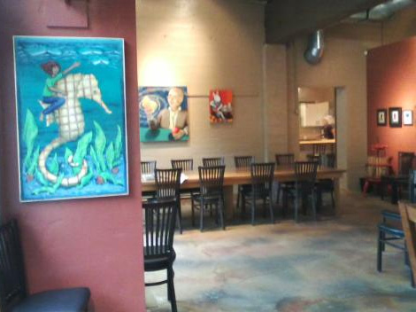 As a reader of this blog you’re aware that I’m interested in (to name a few things) books, food and drink – I post a lot of my sketchbook pages that contain my interests. My finished artwork is often inspired by books, food and drink. So it makes sense for me to exhibit my art in libraries, bookstores, restaurants or wineries. Here are a few pictures of my art hanging in a winery called Burnt Bridge Cellars – www.burntbridgecellars.com – and during the opening party there will be Italian food cooked on the premises! (the winery has a kitchen connected to it where they have cooking classes)