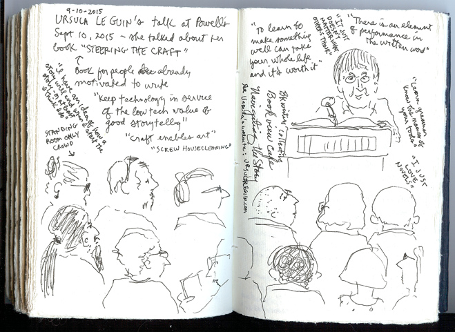 Disclaimer: the “quotes” written around the drawings are what I think heard Ursula Le Guin say during her talk at Powell’s books – any and all errors, miss-scribbles and darn-doodles are mine and mine alone. Any and all brilliance, insight and encouragement is Ursula Le Guin’s. Her website is http://www.ursulakleguin.com/ and she does stuff here: http://bookviewcafe.com/blog/ – And you can get more accurate quotes from Powell’s twitter feed here powells.us/1UI5Epa