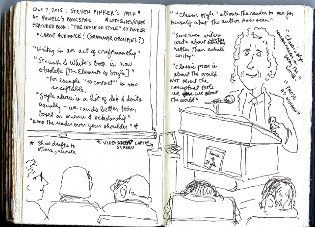 Last Wednesday I went to hear Steven Pinker speak about his book “The Sense of Style” at Powell’s books in Portland Oregon. www.powells.com and this is the sketch I did in my sketchbook while Mr. Pinker talked. The quotes are what I think I heard him say. (Errors are mine, all mine.) There was a digital slide show – so some of the quotes are from what I saw on the screen as it flashed by in a nanosecond.