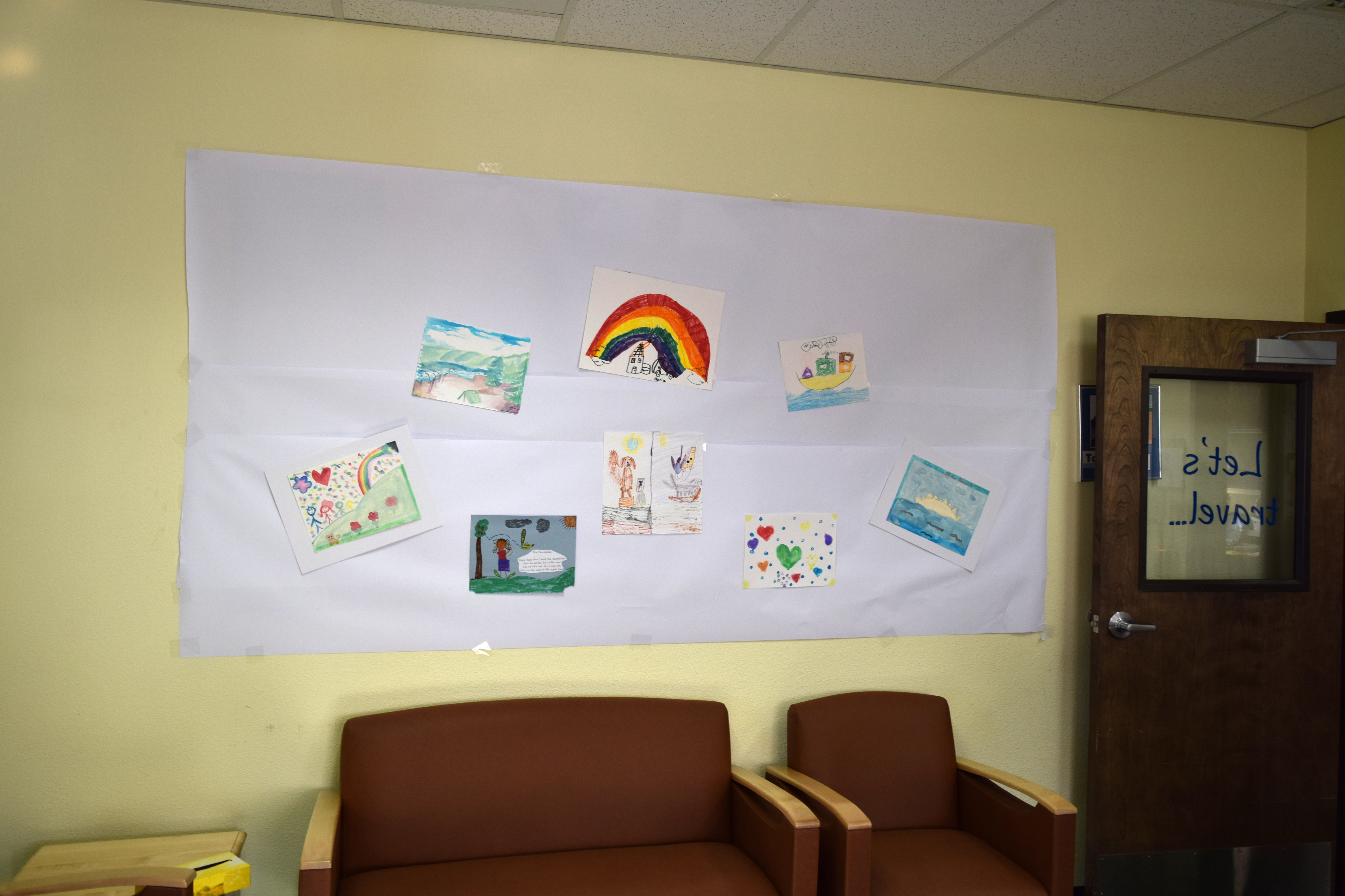 Then we covered the newly installed artwork with white paper and kids artwork to hide it until the party. It looked like this for almost a month while the CJC arranged for publicity and invited people for the party.