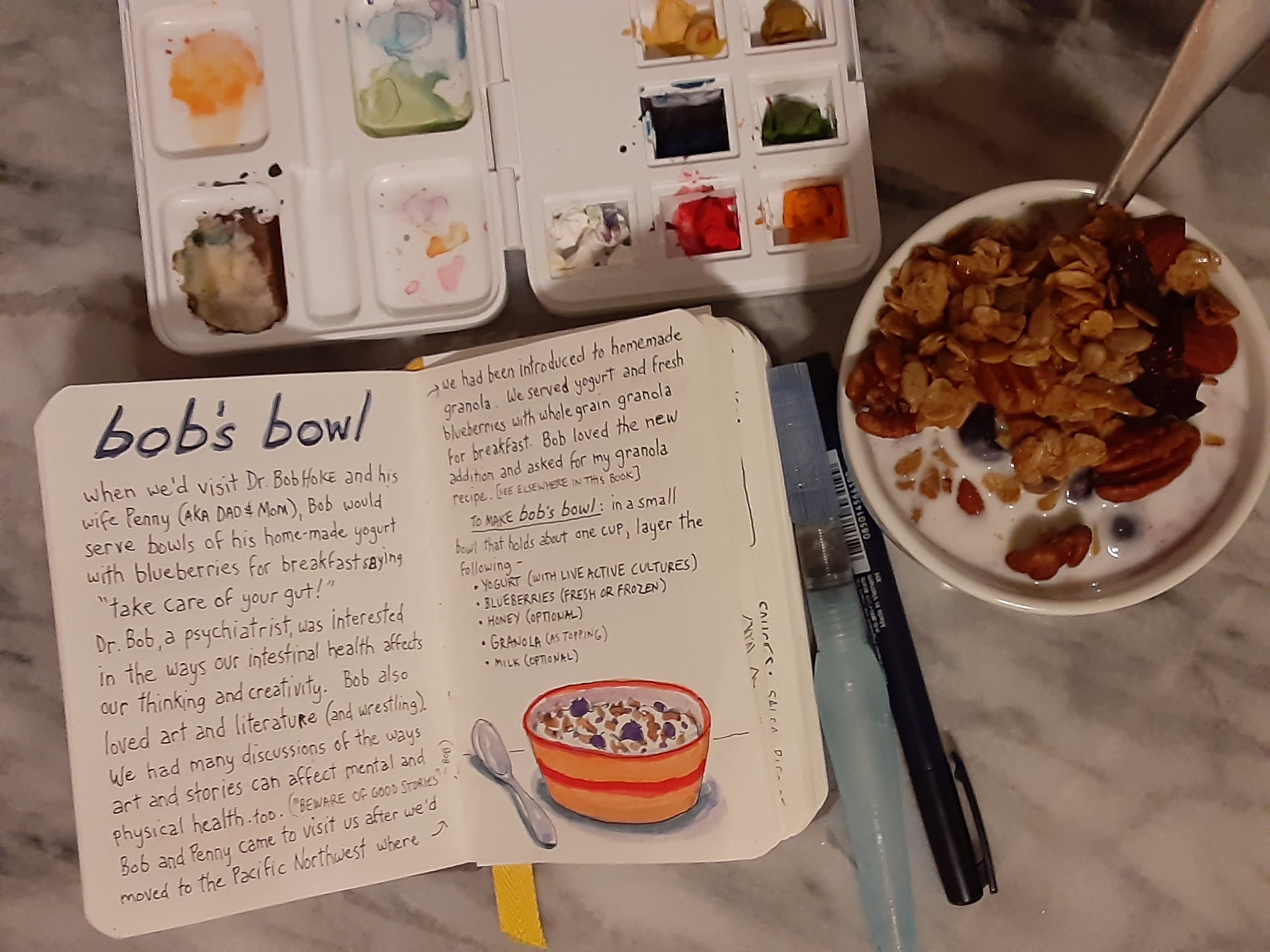 For example, in my last post I depicted a woman reading and having breakfast. Here is the source for the breakfast within the art… the source is my kitchen sketchbook: