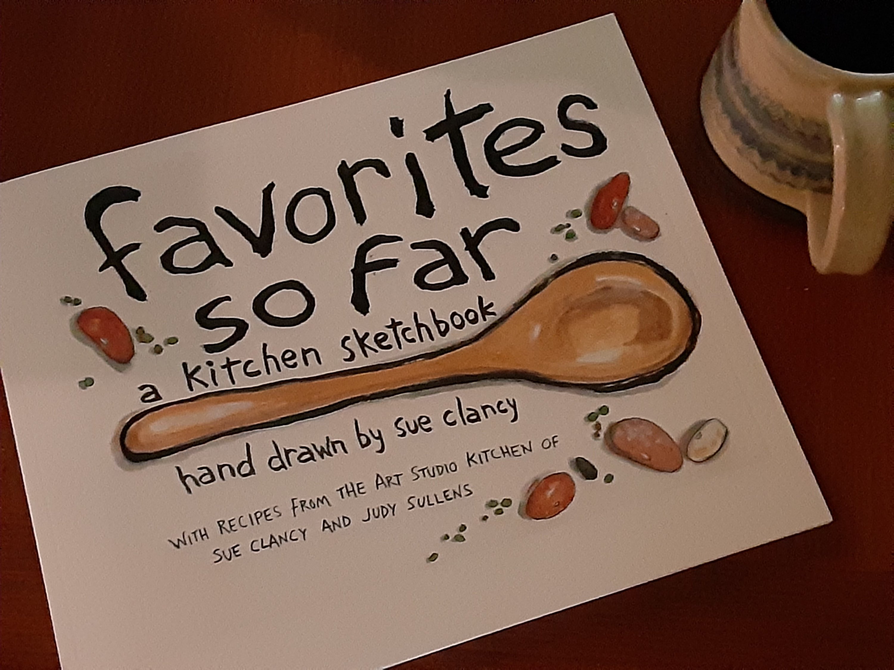 During my exhibits I’ll want to show my sources (like a writer would) so I’ve published a new artist book based on my kitchen sketchbook titled Favorites So Far. The recipes come from both me and my spouse, a kind of memoir sketchbook cookbook… and part of the basis for my fine art. Anyway, here’s a picture of the cover: