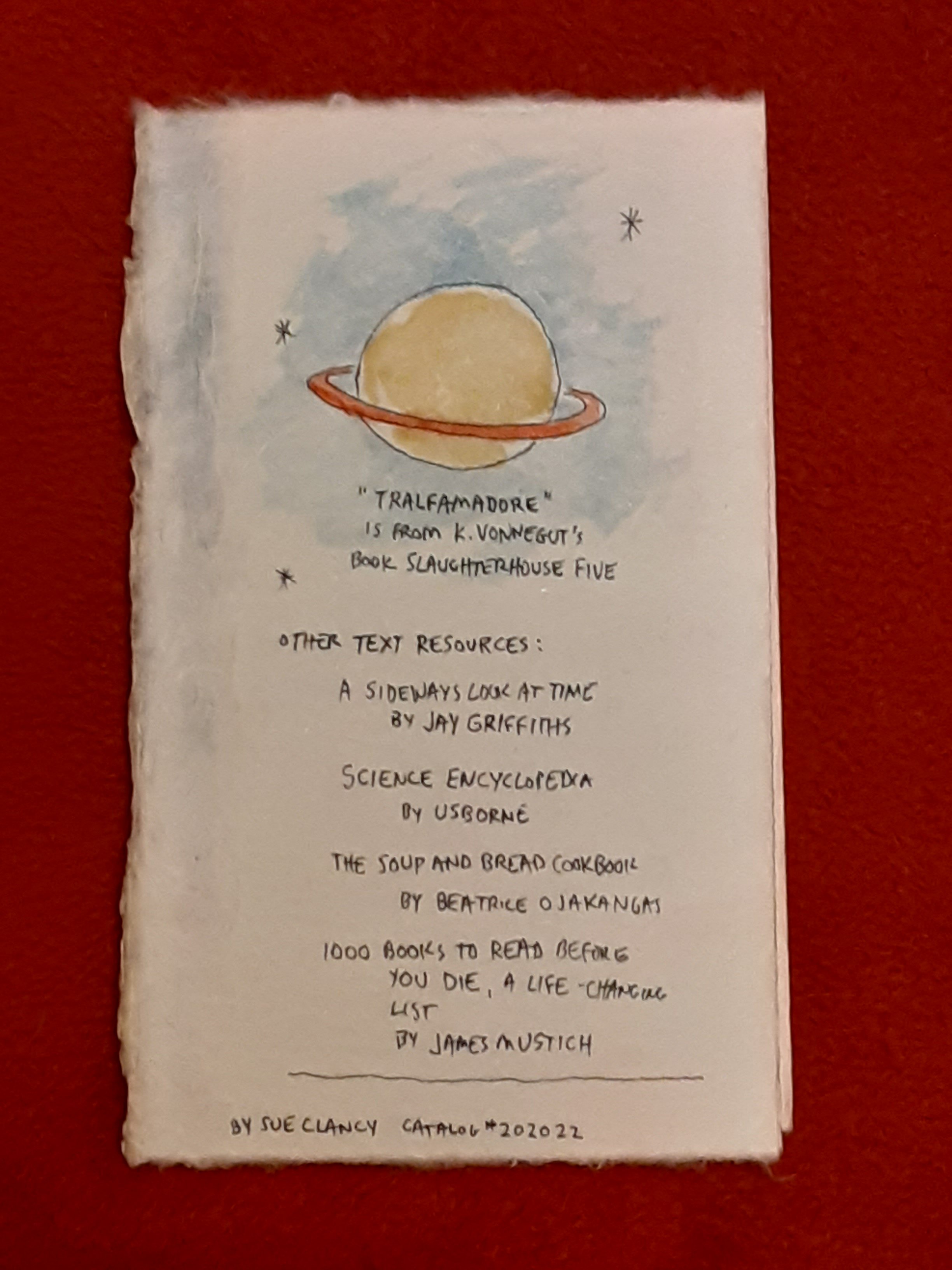 After posting about my painting “Slaughterhouse Chives” some friends said they’d like to see my view of Tralfamadore. So here, below, are several views of my artist book titled “Clancy’s View Of Tralfamadore * a homage to Kurt Vonnegut and other intervals of time”.