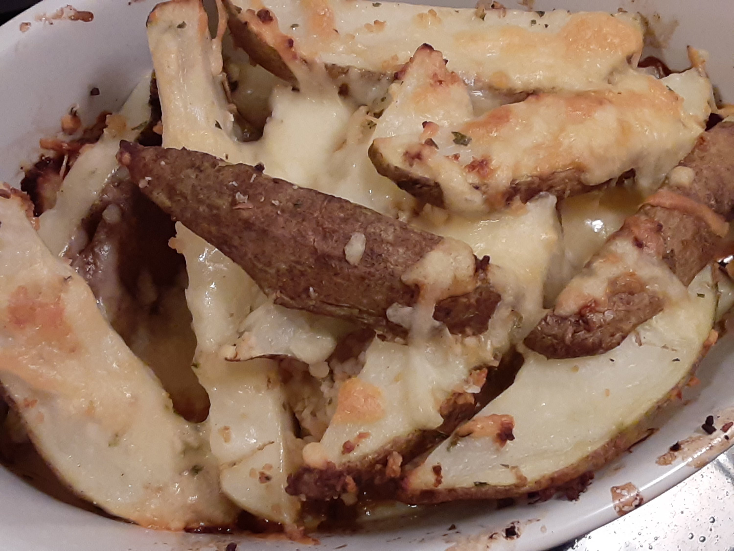 I’ve even tried cooking Jojo’s at home several times and had success! It was so easy to make I didn’t even do my usual kitchen sketchbook notes about the dish: briefly boil medium size unpeeled potatoes (one per person), let them cool. Preheat oven to 425 degrees. Cut each cool potato in half and then into thick strips. (The potatoes are still firm). Lay parchment paper on a baking sheet with a lip. (Or if only serving 2 people grease a casserole dish) Pile the cut potatoes on the pan, drizzle olive oil, garlic, and/or salt and/or pepper, and/or cheese and mix with hands. Spread out into a layer and bake for 20 to 30 minutes. Watch carefully and at the end of baking, broil to make the potatoes crispy to suit. Here’s a photo of one of my efforts (in a casserole dish, potatoes with garlic and cheese)