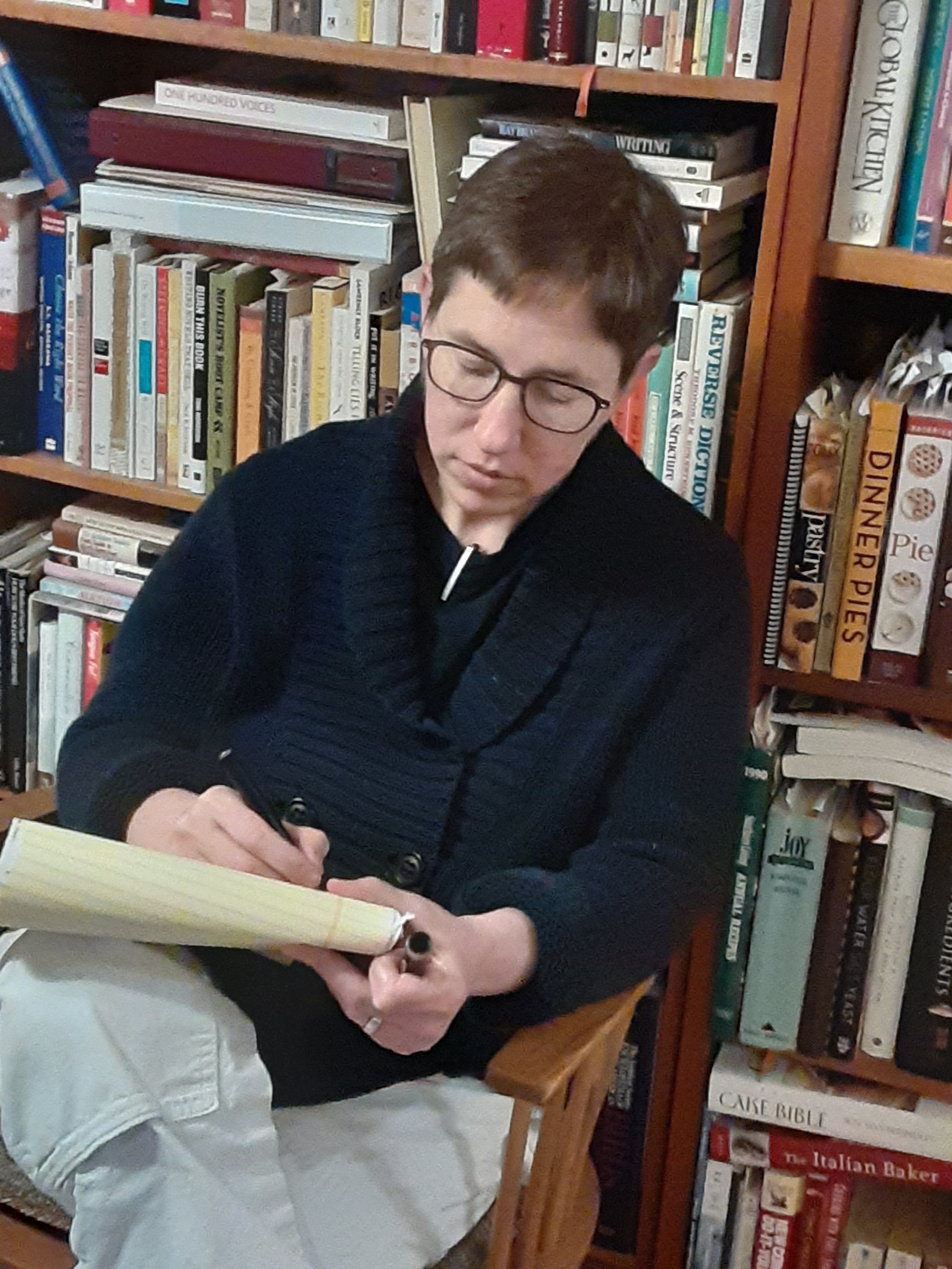 In this photo below, I am writing notes on a pad with my fountain pen. These are very loose notes, I’m just playing. (My studio laptop assistant had another project to work on and so isn’t in the photo.) I’m sitting near a lot of books about writing – and several dictionaries – just in case. 😉