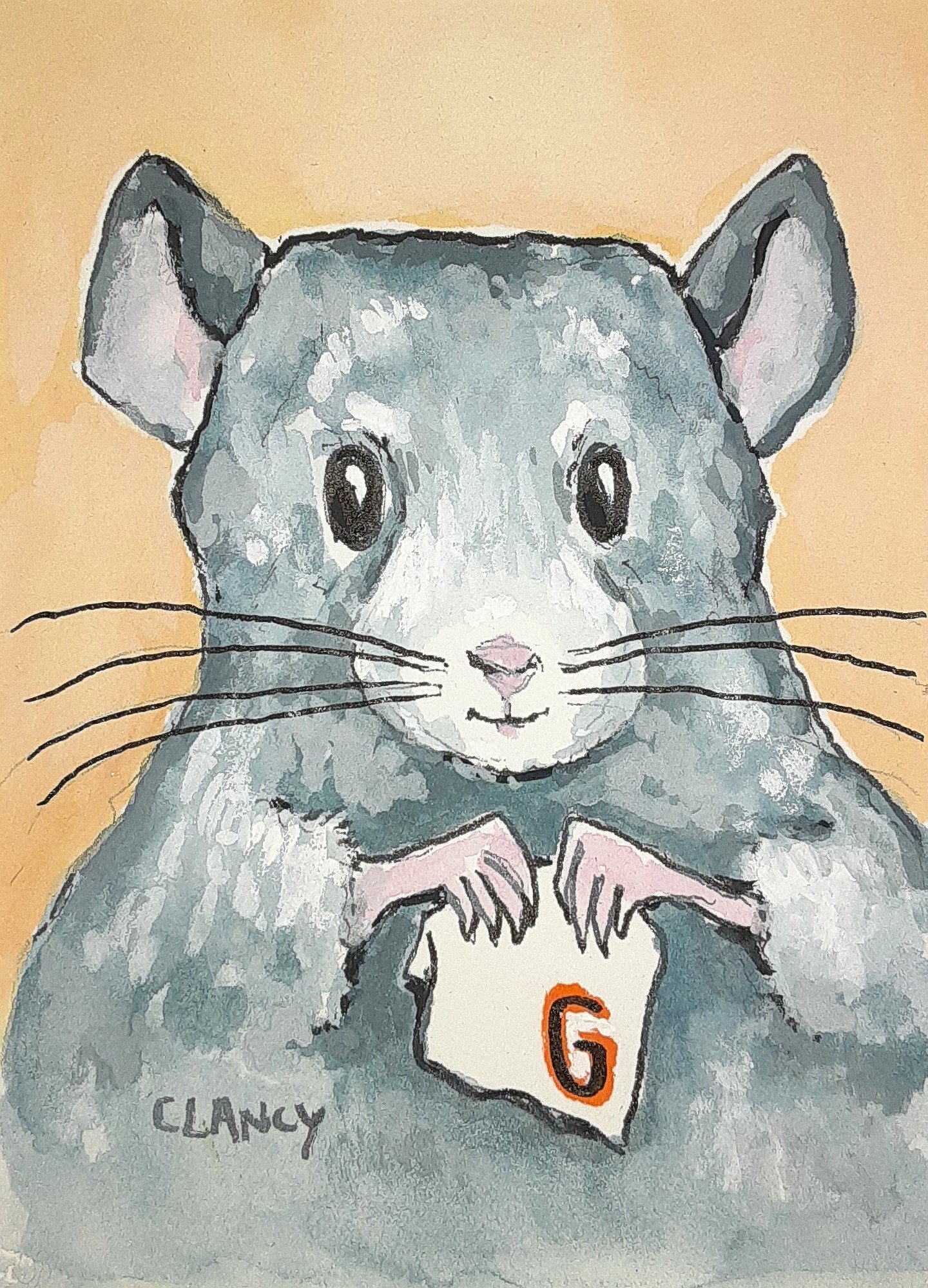 After college I worked as a biological illustrator. I shared an office with a chinchilla and other animals. When I would insert my key to unlock the office door the chinchilla would make excited noises. We had a routine in which we would talk with each other as I made coffee then I would let the chinchilla out of her cage and would sit and comb her for a few minutes. Then I’d make her breakfast, put her back in her cage, feed the other animals and get to work. This joyful start to a day was on my mind while creating this portrait of Gilda.