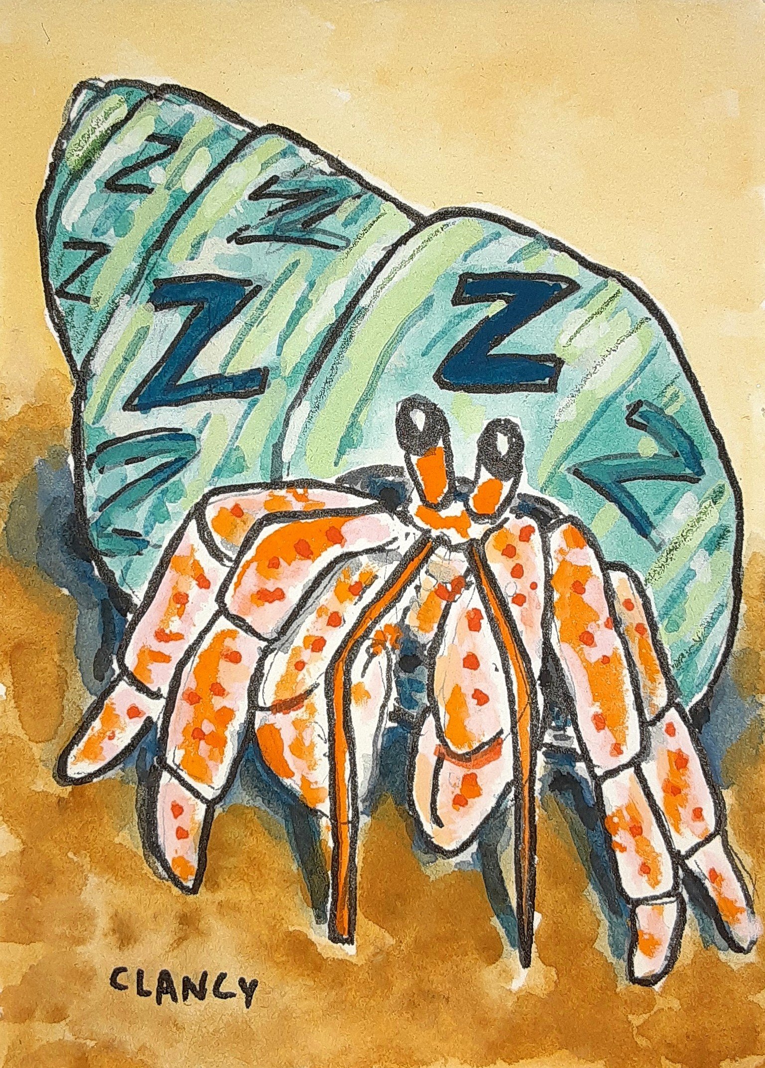 Earlier in this project a friend suggested that I do a hermit crab named Zorro. Naturally the crabby crab would like us all to be quiet and have a nap.