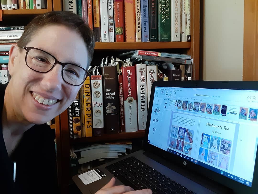 As I completed the original artwork for my abecedarian poem I also worked on the graphic design of Alphapets by Clancy. That’s part of what makes this an “artist book” – it was conceived and constructed like an art object – by me. My spouse did proofread the text, make some book design suggestions. That, in my mind, is akin to submitting a bunch of artwork to a gallery for exhibit. Here’s a photo of me doing the graphic design hocus pocus.