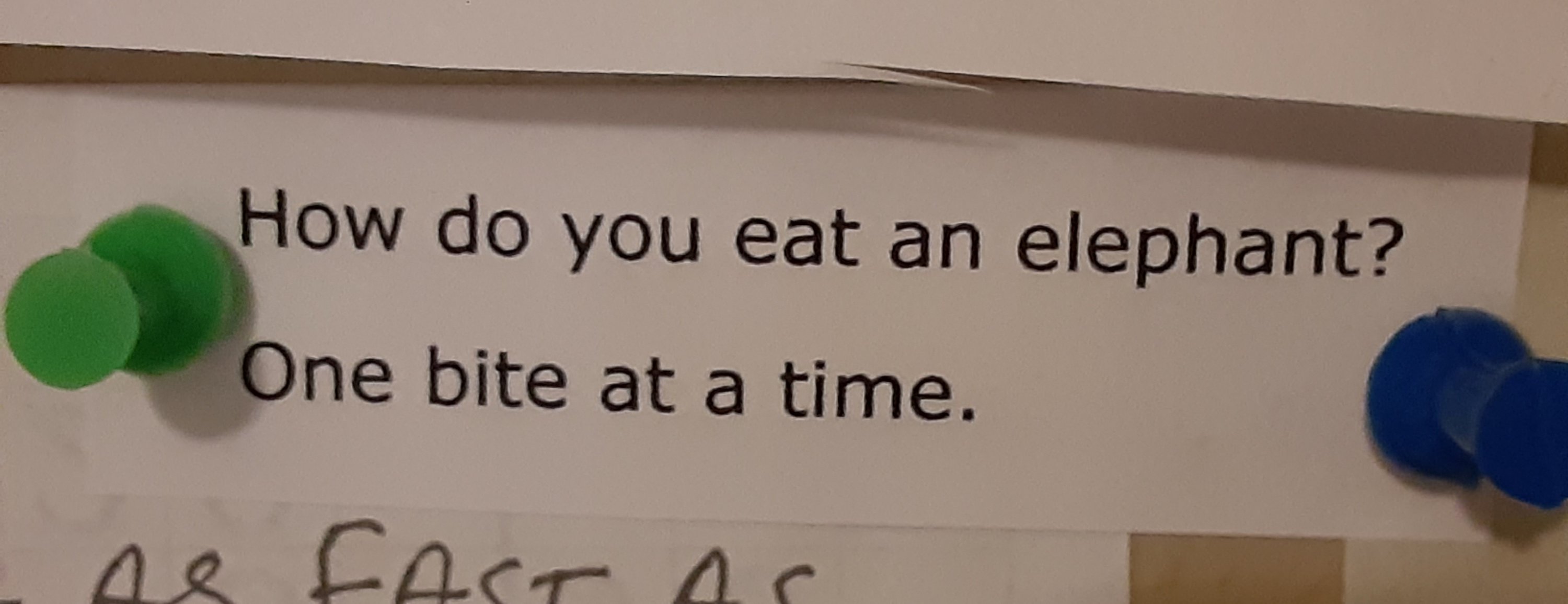 I’ve been asked how I manage projects, like my “Readings From The Heart” exhibit, over a long duration. Half jokingly I replied “one bite at a time”. My joke is in reference to this saying I have thumbtacked to my art studio wall.