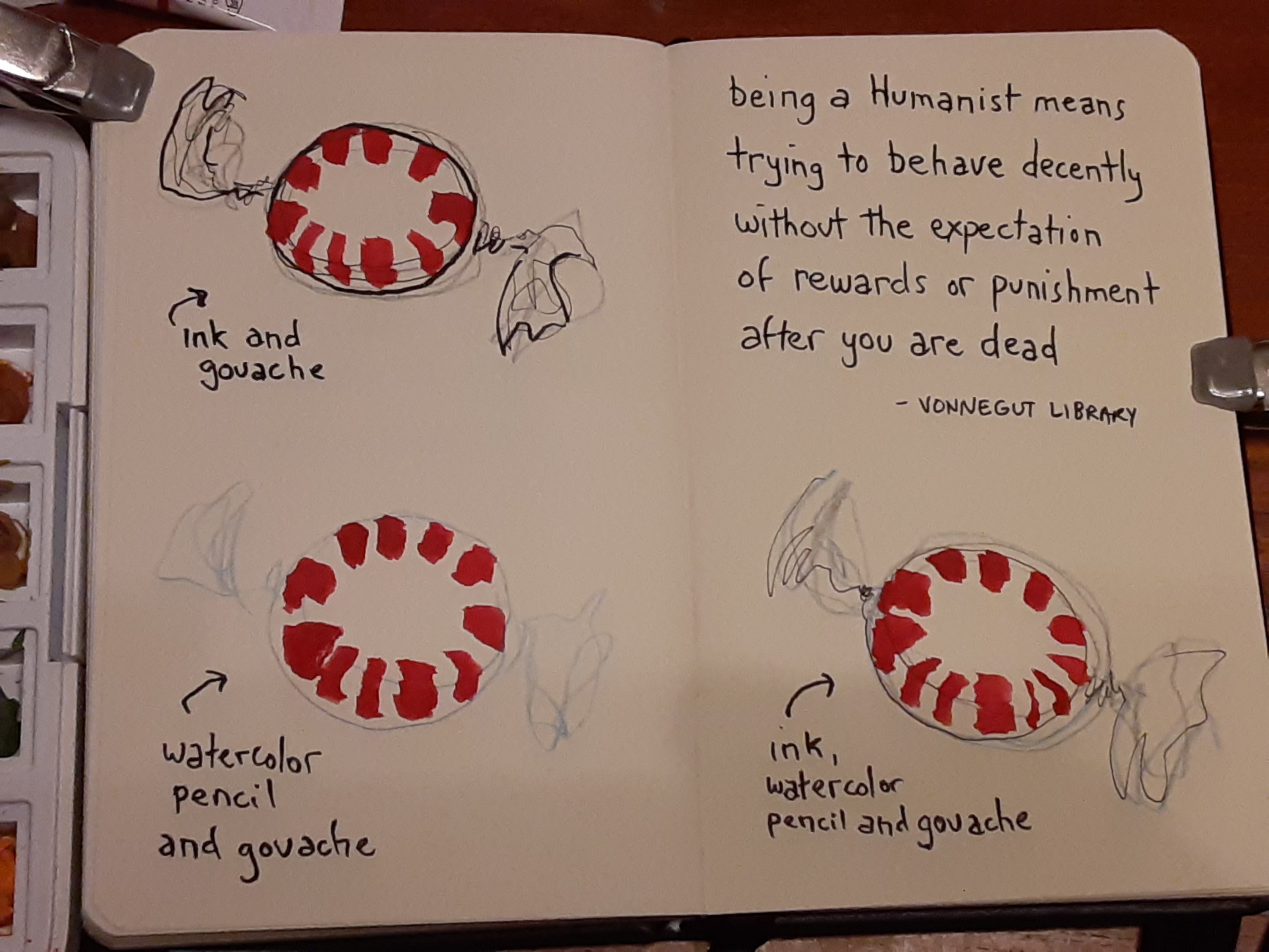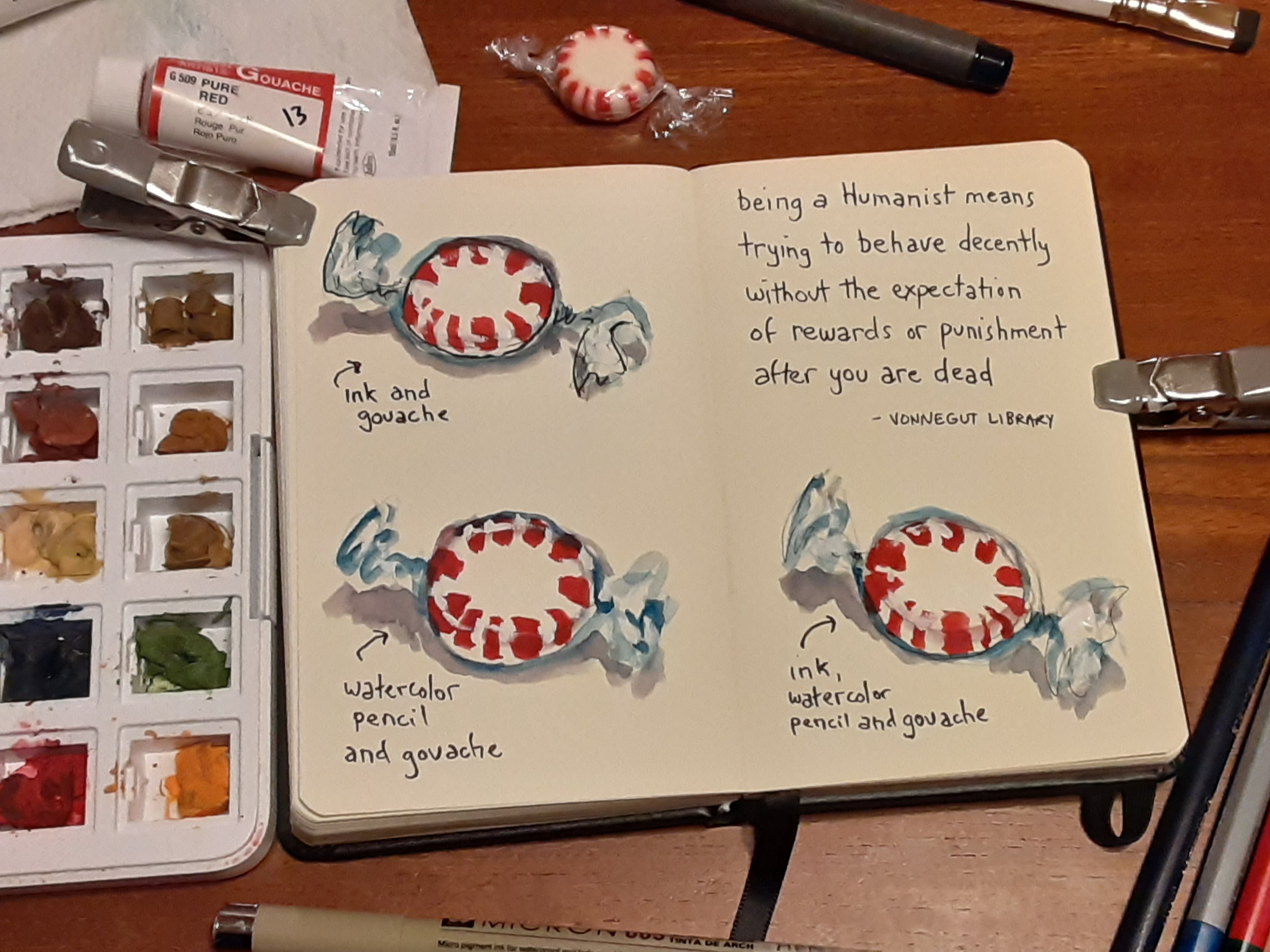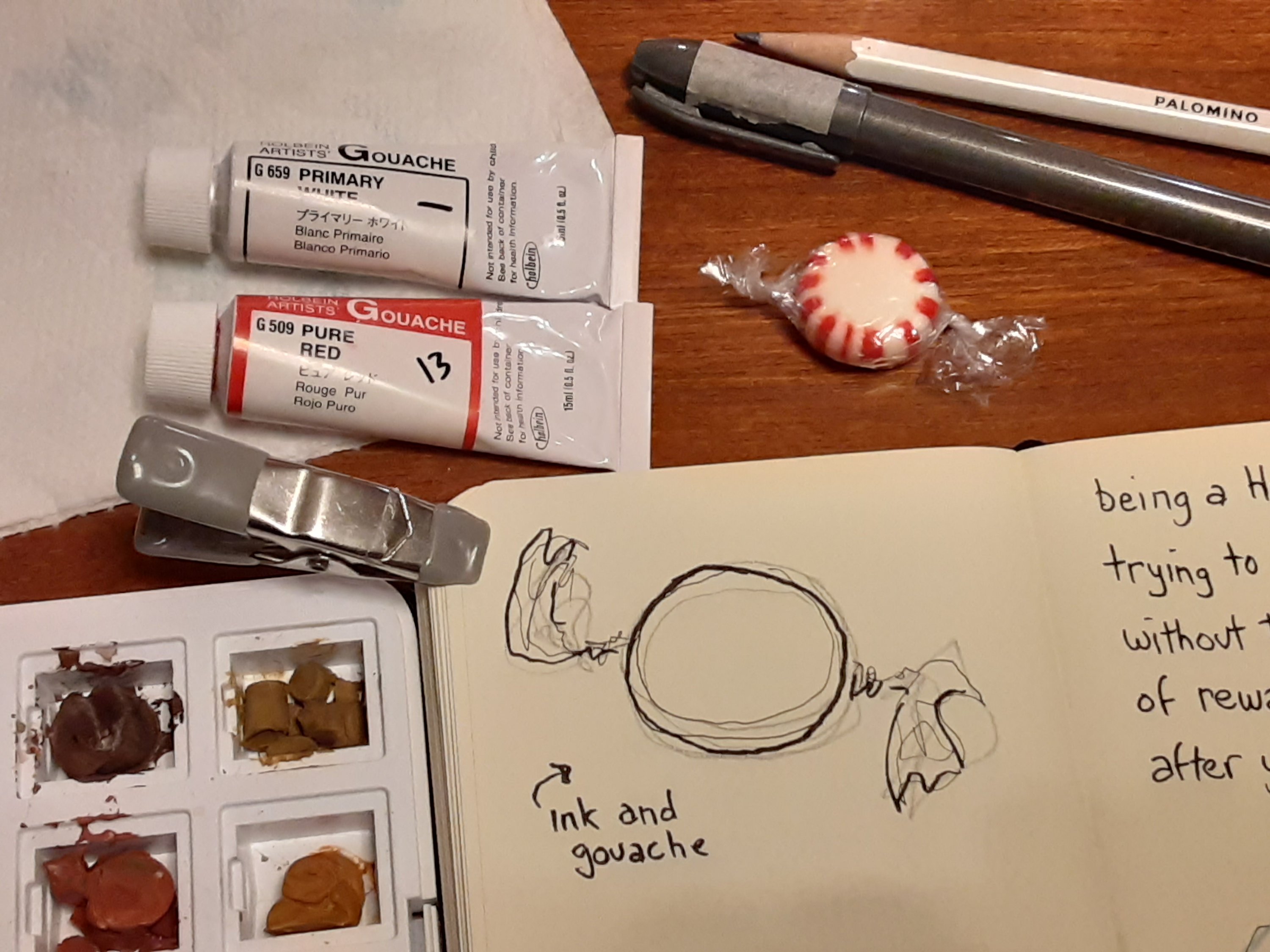Here’s a series of photos showing my gouache working methods in my sketchbook. (This is also my work method for fine art and other projects.) In the first photo you see my 3 x 5 inch watercolor sketchbook held open with clips. Also pictured from the top left and rotating clockwise: paper towel, peppermint candy model, graphite pencil, 3 watercolor pencils, 2 waterproof ink pens, a water brush and my lidded paint palette with its wells of various dry gouache colors.