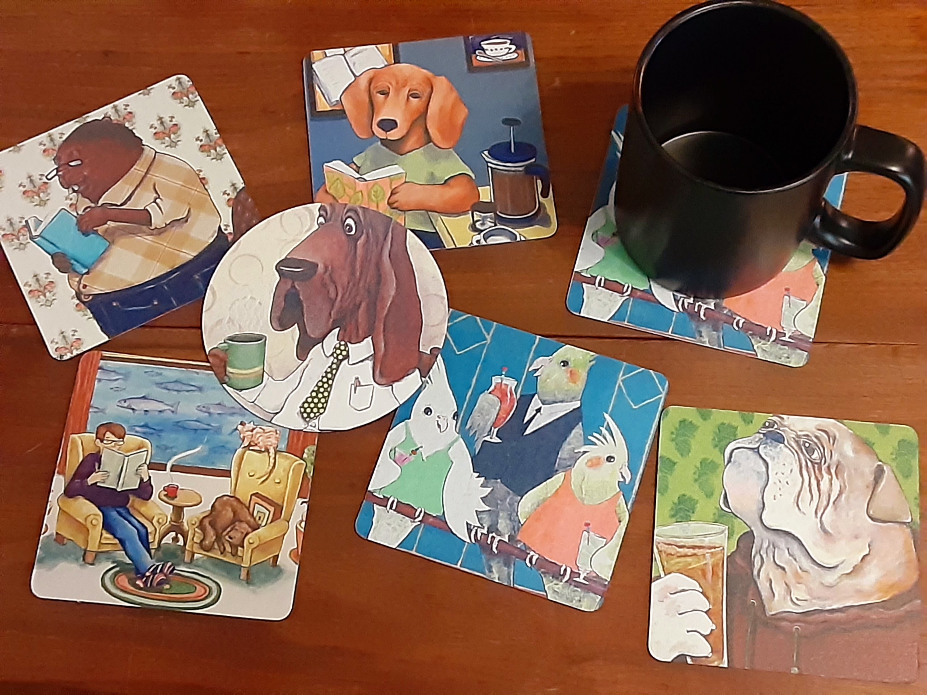 Anyway, I’ve been enjoying the puns within puns… my fine art about reading books that becomes a bookmark ribbon for a reader. Or my fine art that includes a beverage becoming a drink coaster…