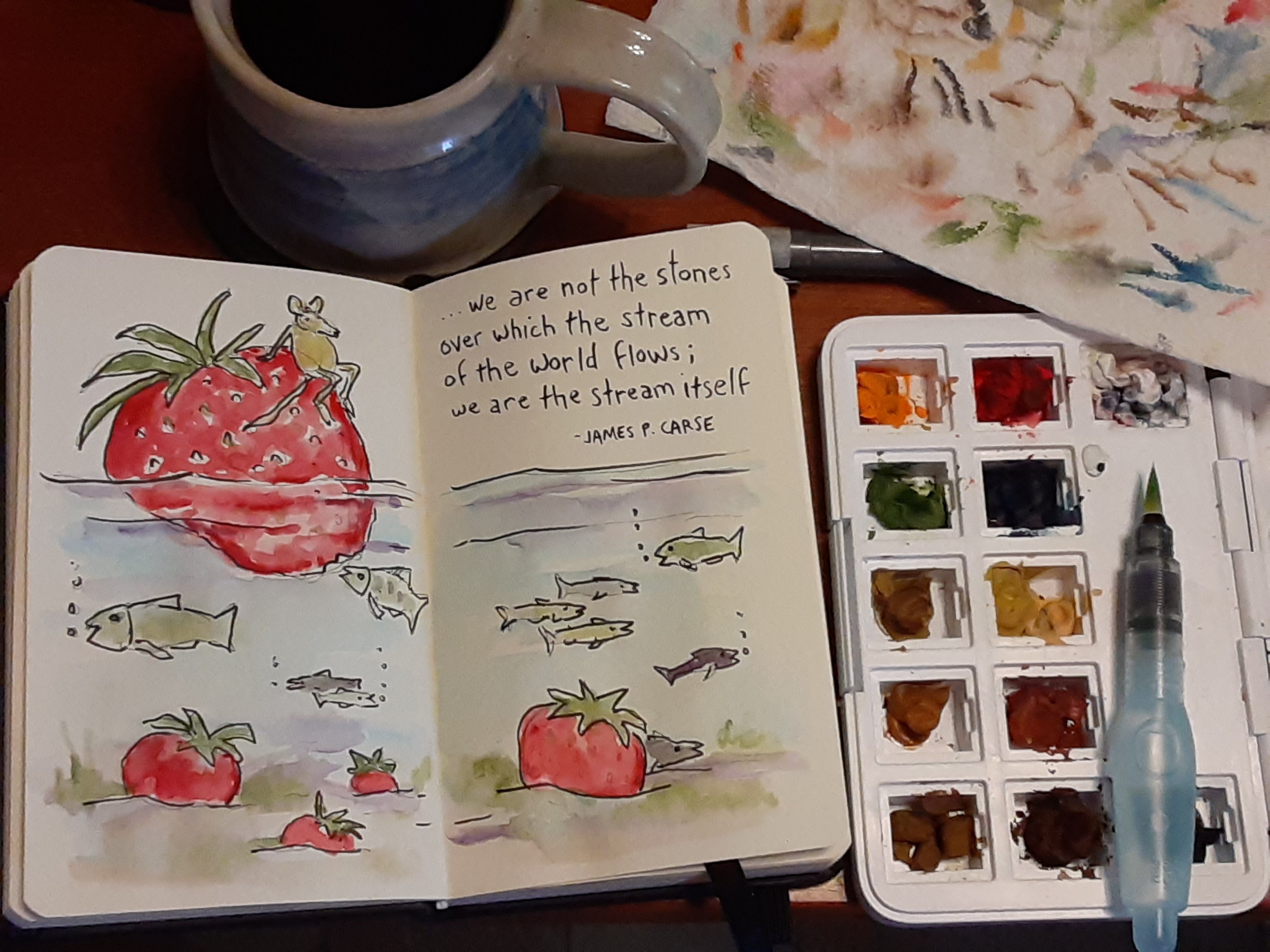 Also as part of my sketchbook practice I’ve written a short story that explains what happens to beverages when you’re reading. It’s like this: