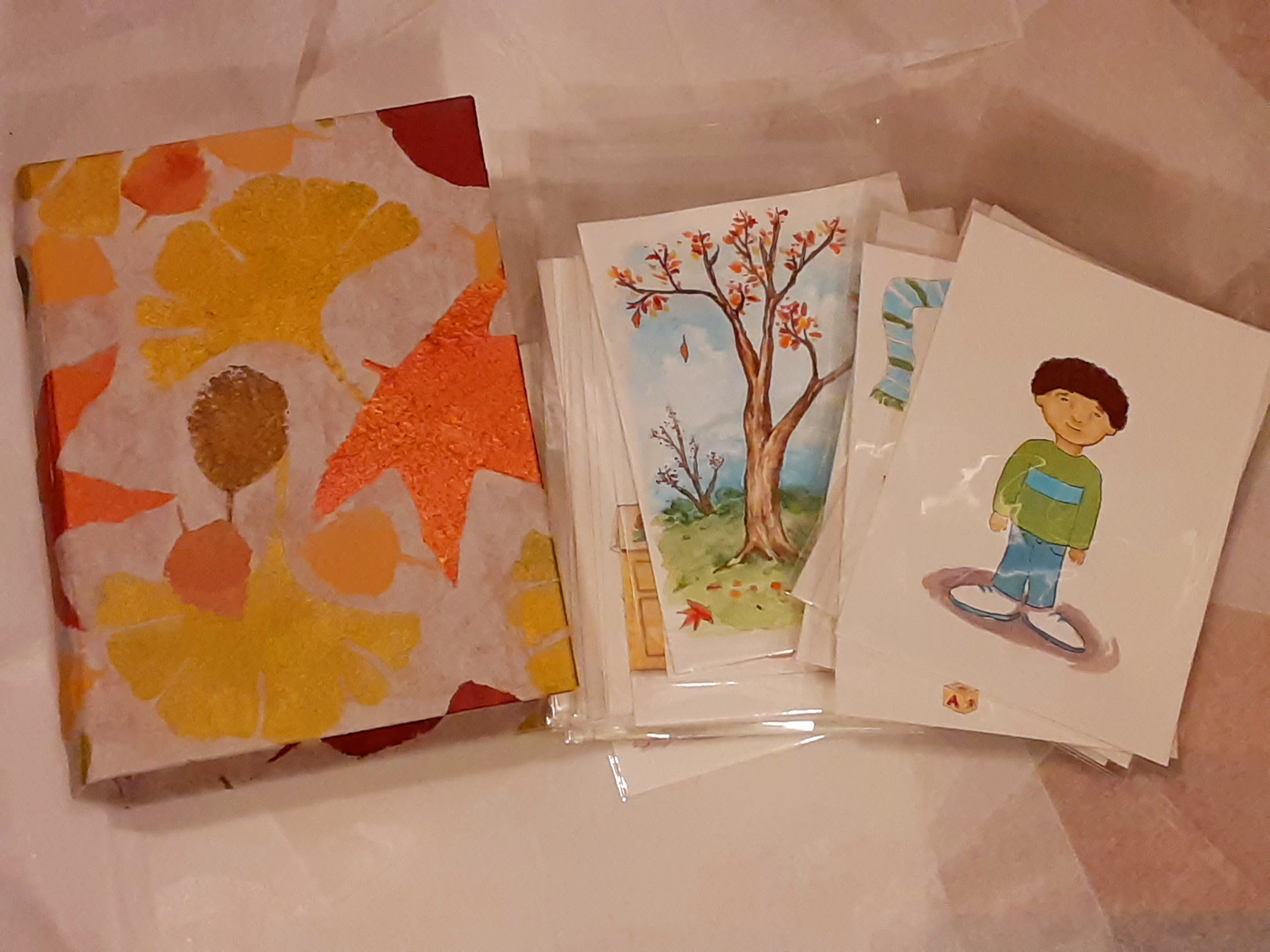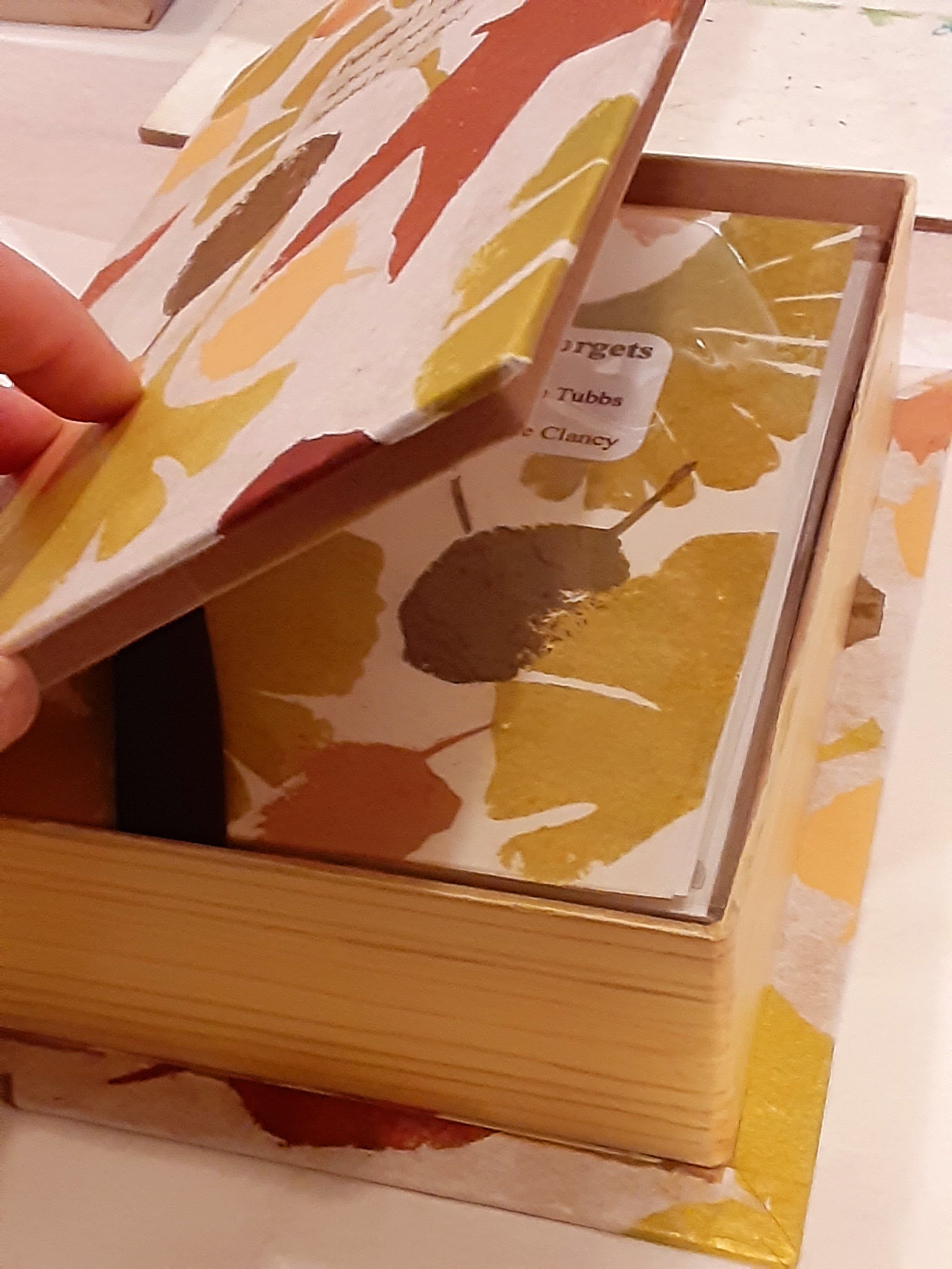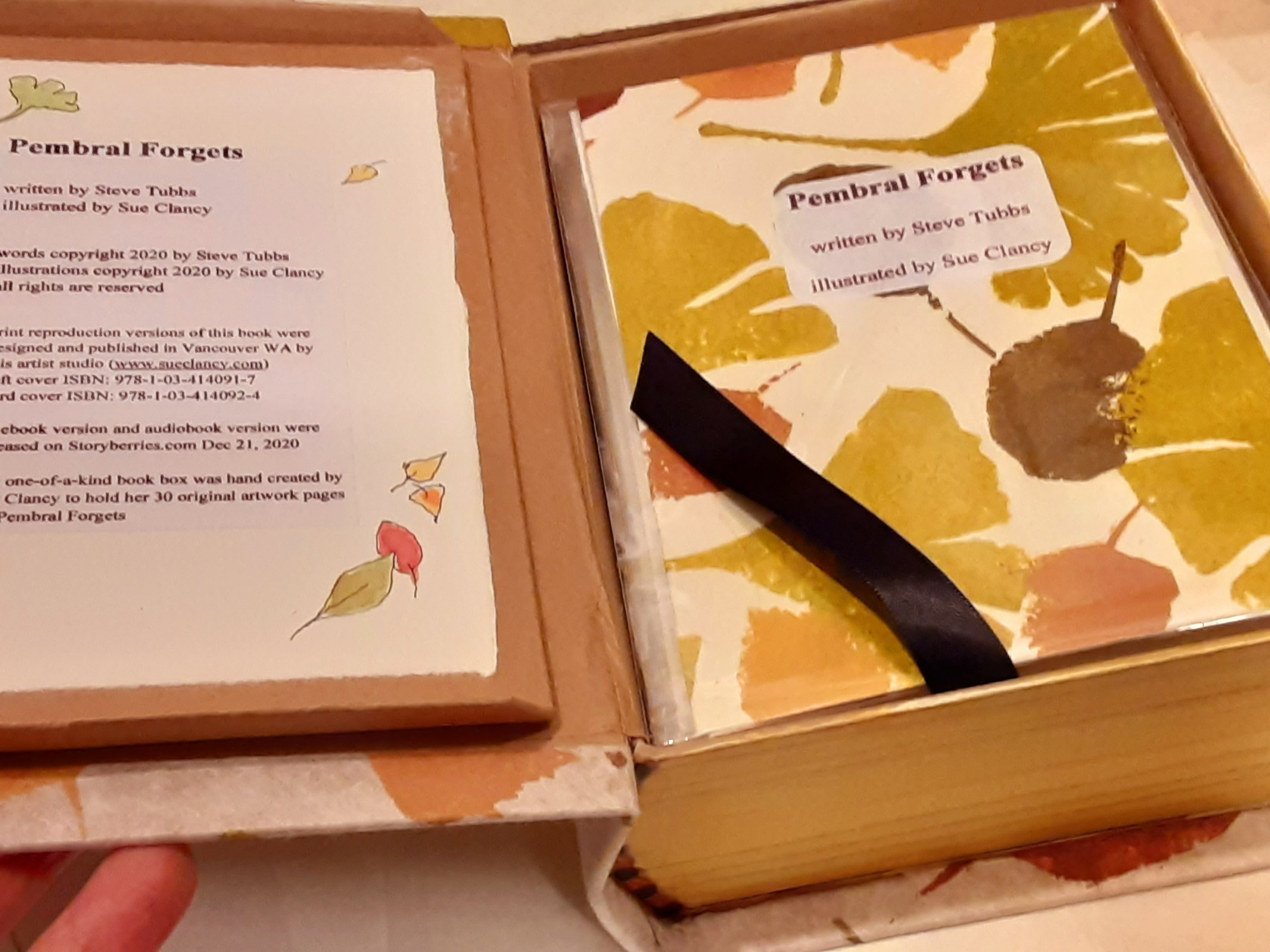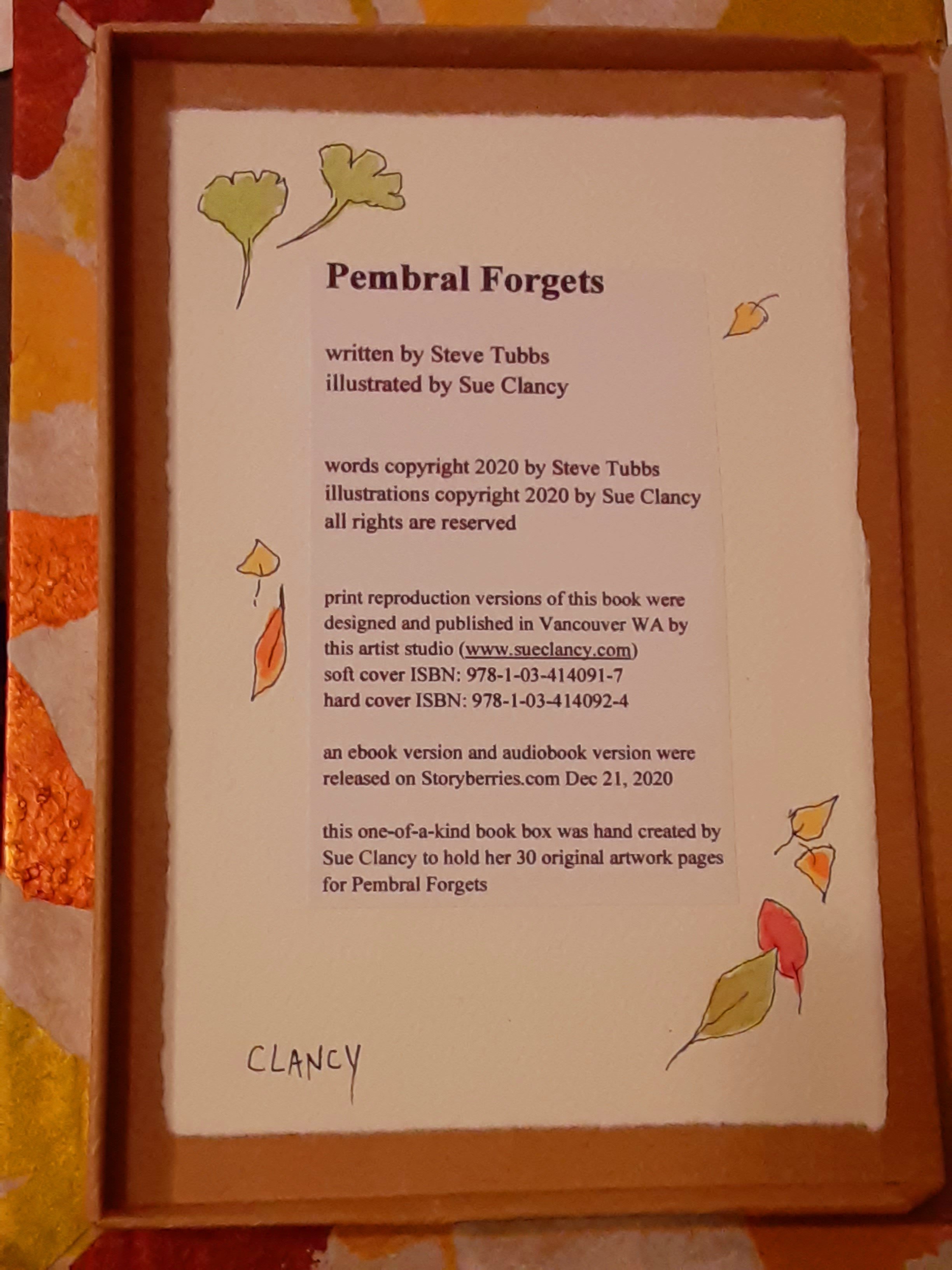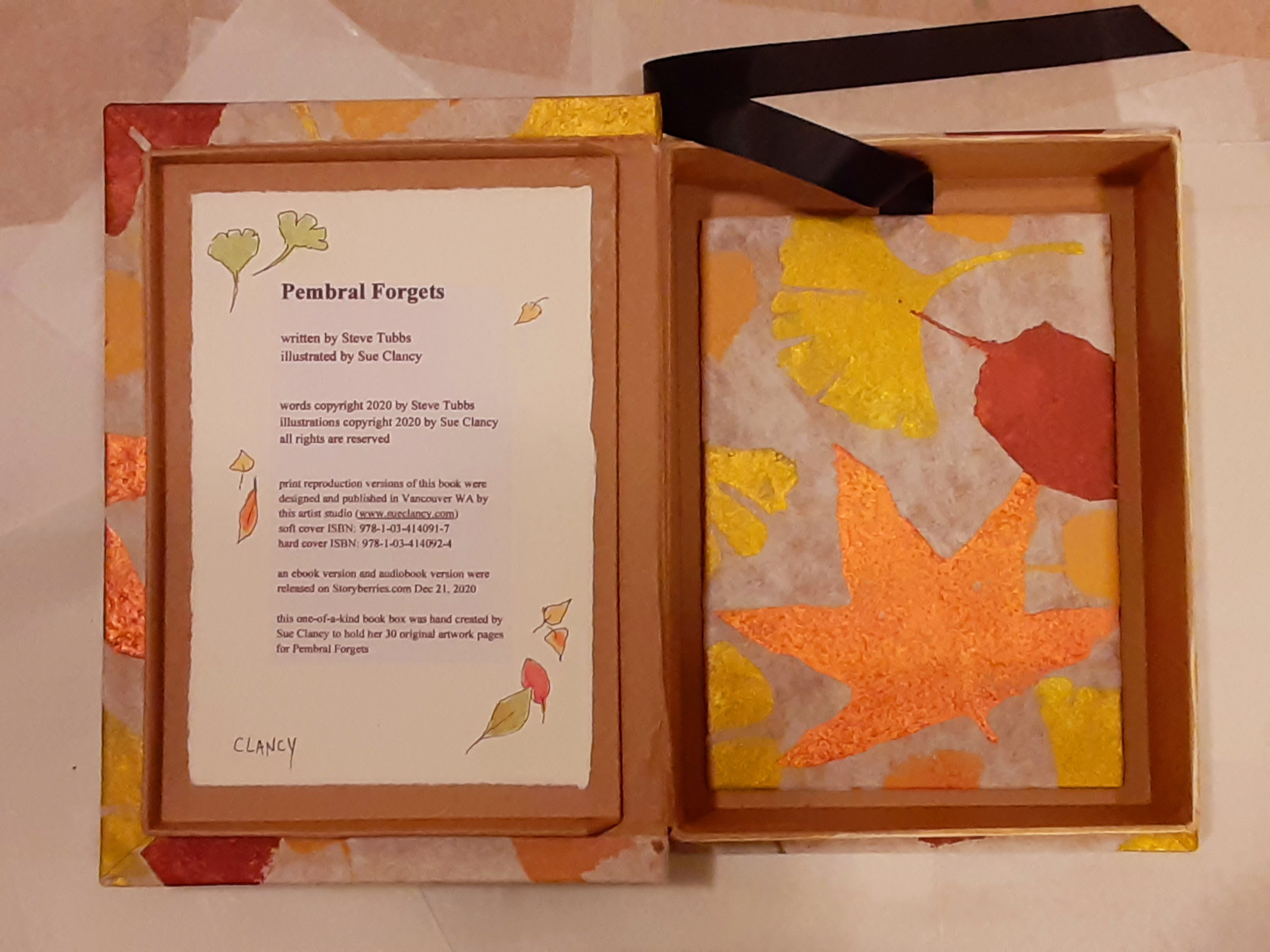 The inside of a book is made up of pages which are called “leaves”. The handmade box I’ve been constructing holds all of the “loose leaves” for Pembral Forgets. I love the pun…a story about fall leaves housed in a box covered with a pattern of leaves, containing loose leaf pages….