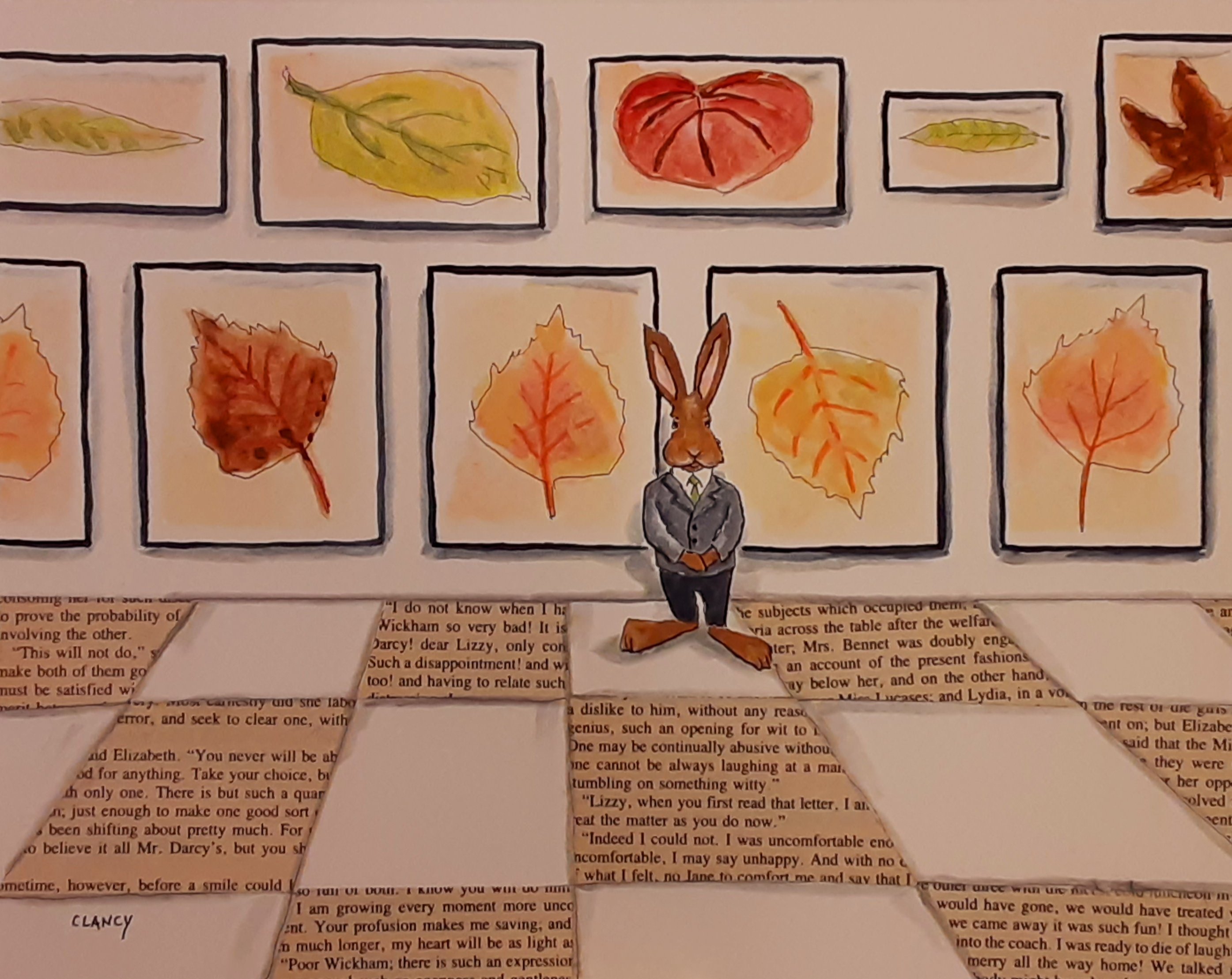 I’m sure you noticed in the paintings that in addition to my use of yellows, greys, leaves, lemons I also used my current “everyman” characters in the form of rabbits.