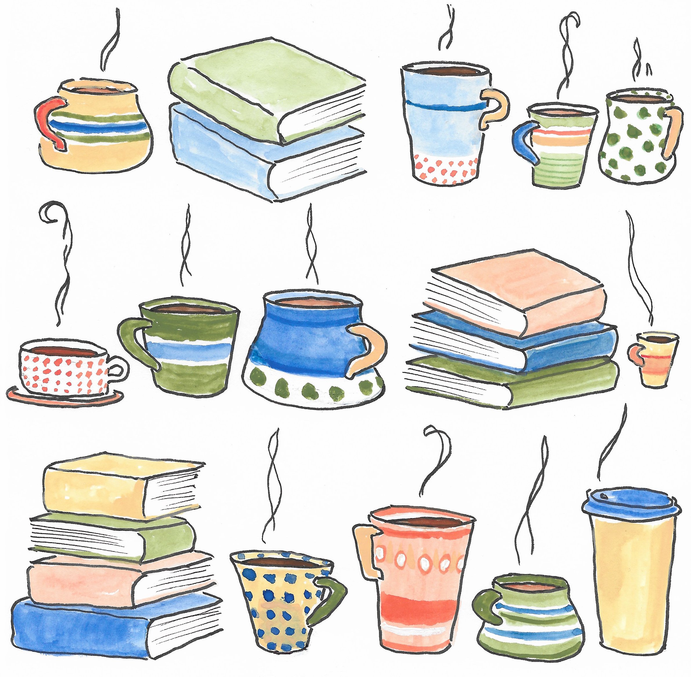 Here’s what I did with the above original ink and gouache drawing of hot beverages and books: I made a fabric pattern of it for my Spoonflower shop.