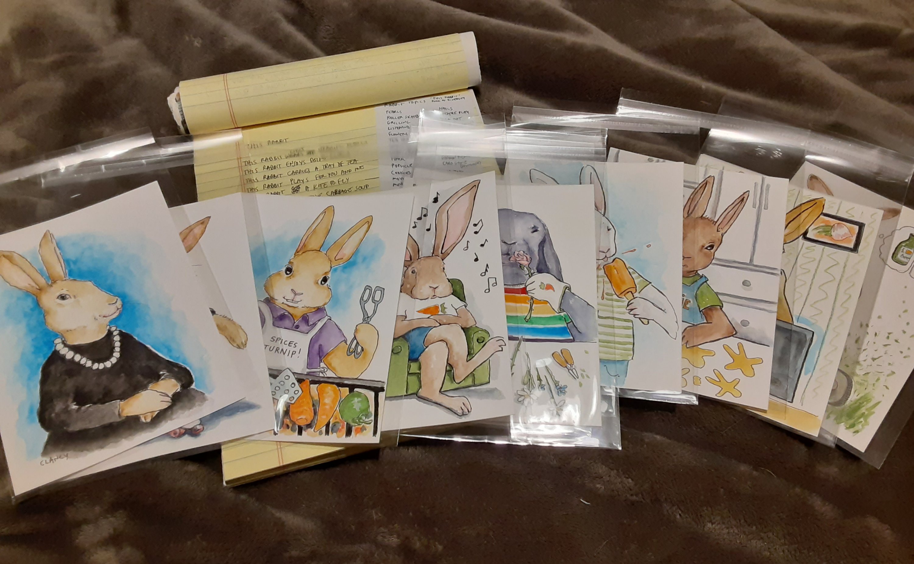 Speaking of good things, books and rabbits: I’m starting a new children’s book. One question I get asked “which comes first the art or the words?” and in the case of this new book the art largely came first. Here’s an array of the illustrations I’ve done so far along with my legal pad on which I’m scribbling book text drafts by hand using my fountain pen. More about this project in future posts.