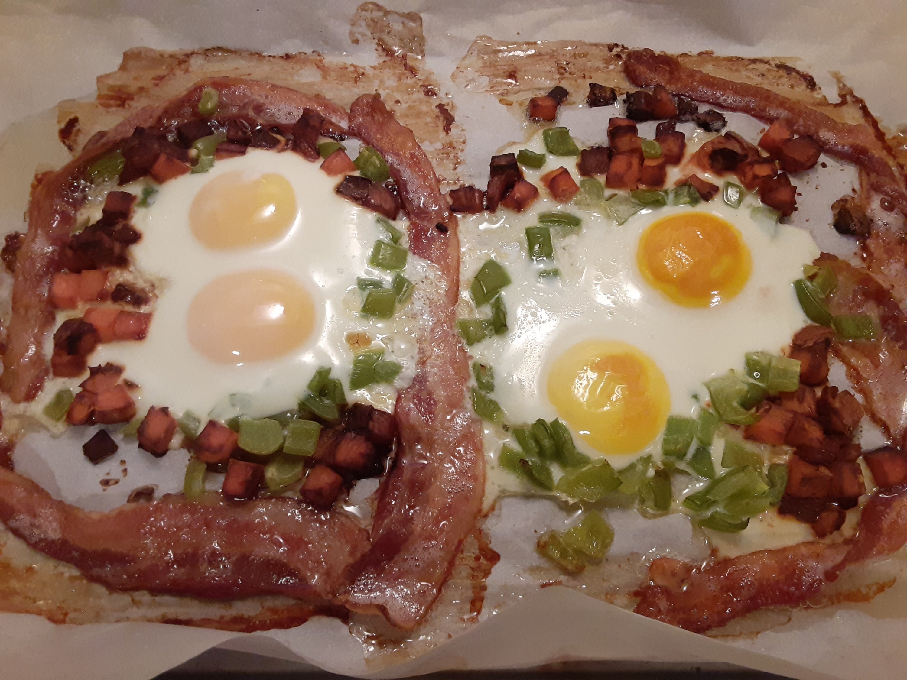 Since we’re nearing Easter naturally my thoughts turn from rabbits to eggs. This week I tried, in the name of I’m-to-busy-to-cook, a sheet pan breakfast with eggs, bacon, green bell peppers and sweet potato chunks. It worked reasonably well … one set of eggs got a little more firm than I like but everything – including the eggs – were quite enjoyably edible. And enjoyably edible counts!