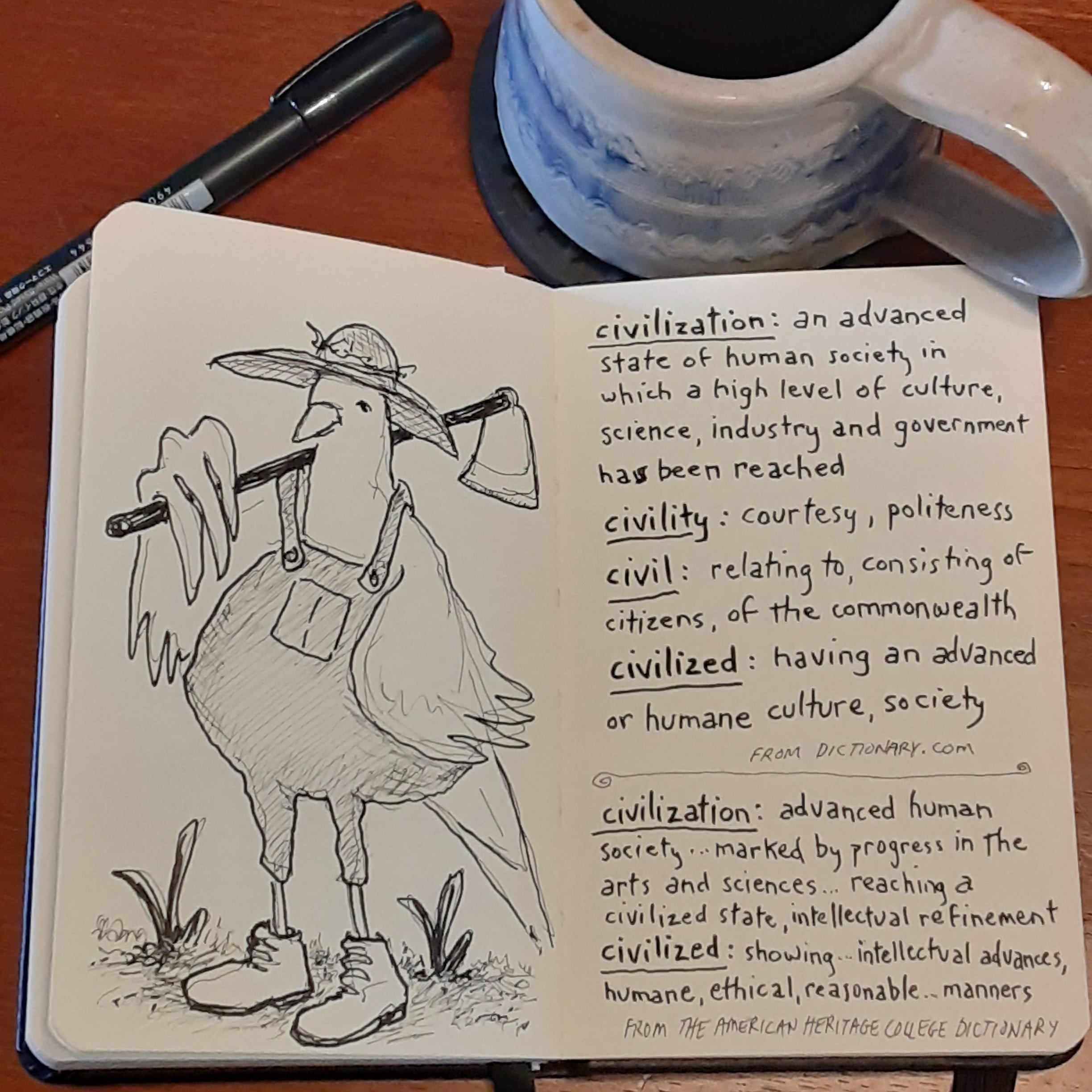 Behind these sketchbook thoughts is my ongoing thinking about Jane Austen’s work. In her novels – Pride and Prejudice most certainly – Austen writes of civility and the social comedy of manners. I see Austen’s work as exploring how stories affect civility and how the presence of civility, or lack thereof, in turn affects not just the individual but also the people around them and the larger society.