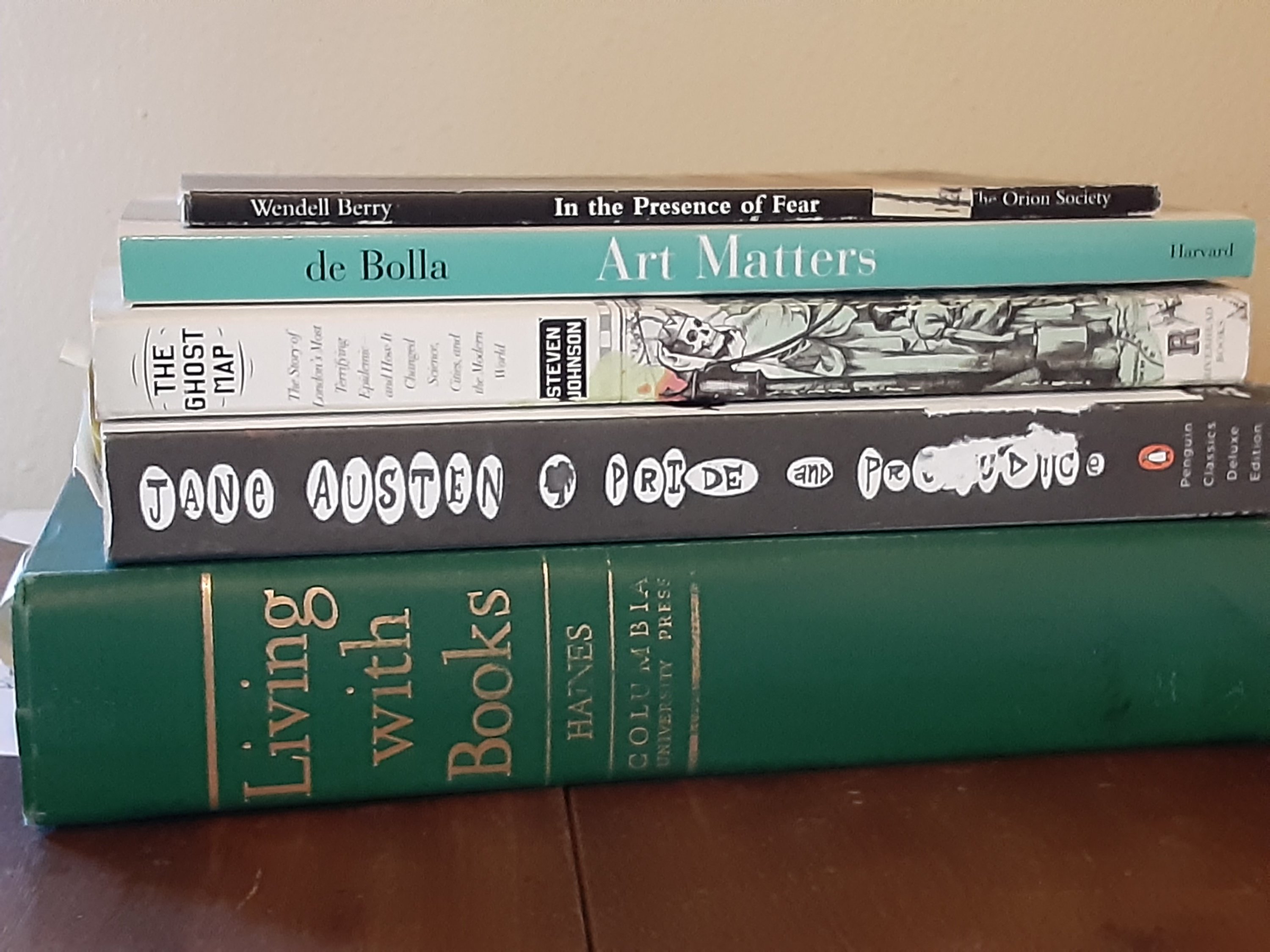 Here’s some of the books I’ve been looking at (besides the ebook murder mysteries on my phone): Living With Books by Helen E. Haines, Pride and Prejudice by Jane Austen (my new copy!), The Ghost Map by Steven Johnson, Art Matters by Peter de Bolla, In the Presence of Fear by Wendell Berry.