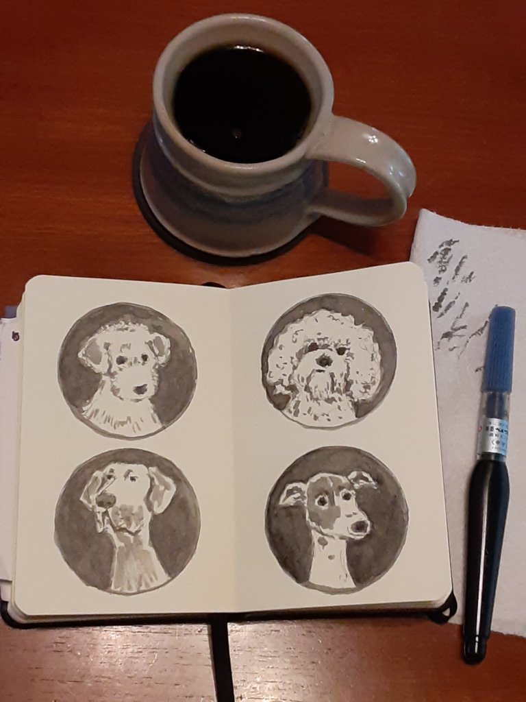 I trust it won’t be too much of a spoiler to say that doing dog paintings in black and white is helpful when I’m also doing a series of dog portraits in color. Nothing like painting in black, white and shades of grey to sharpen my observation skills. Very carefully I made sure that both of my main projects are dog related. This way the project concepts strengthen each other. Kind of like how doing similar but different physical exercises strengthen muscles better that just doing one kind of exercise.
