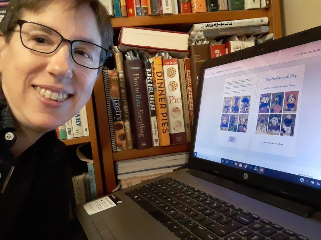 As I mentioned in another post I tend to work first and talk about the work later. This means all of the artwork is finished for The Professional Dog and I could work hard this past week on the book layout. Here’s a photo of me at my laptop doing the book layout.