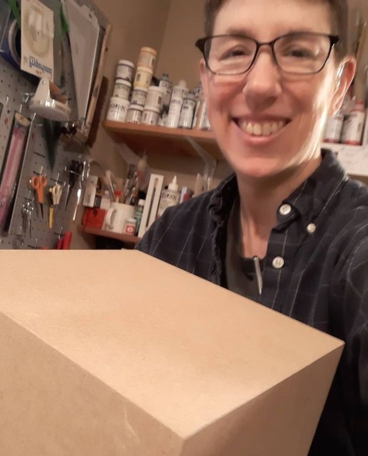 And now for what we’ve all been waiting for (drumroll please) the Holiday Box Project! The Box Project exhibit opens at Caplan Art Designs the first Thursday in December. That’s why we artists were asked to wait to post and to only do a “teaser” post now because the Thanksgiving gallery event happens first. We artists were each given by the Gallery a solid brown wooden box, 8 inches cubed, some time ago so we’d all have time to create art on them. Below are before and after photos of my box.