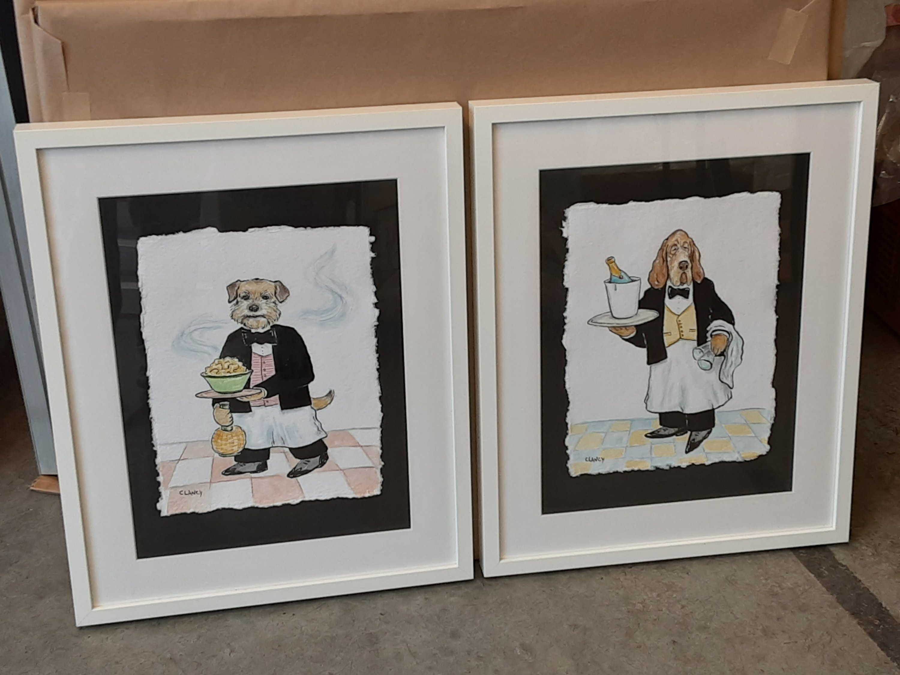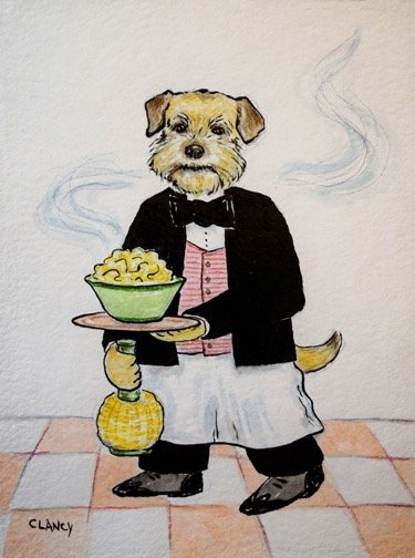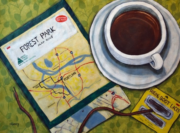 The Caplan Art Designs Gallery did a studio visit and selected some artwork from my studio stash for the special Thanksgiving event the Gallery is doing Nov 26, 27 and 28th. Each of the artworks Caplan selected are autobiographical. I’ve been sharing details on my Instagram page for each of these pieces but generally speaking each painting is about some aspect of my life here in the Pacific Northwest. Like the time we went hiking in Forest Park and my bootlace broke and we discovered a wonderful coffee shop that also sold bootlaces! Or the Rainier cherries we enjoy eating by the sea. Or the fine dining we’ve enjoyed…my feeling is reflected in my choice of dog breed depicted. And the bookstores… There are many more artworks selected by the Gallery than I’ve included below but perhaps this gives you the idea? The Gallery event happens the 26th, 27th and 28th in Portland Oregon.
