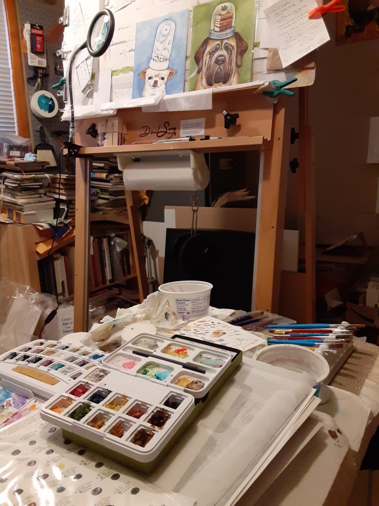 I’m sure you’ll recognize one of the dog paintings on my easel. The other dog you’ll probably see next Monday. And I’m sure you’ll notice my new magnifying glass (last post) in use!