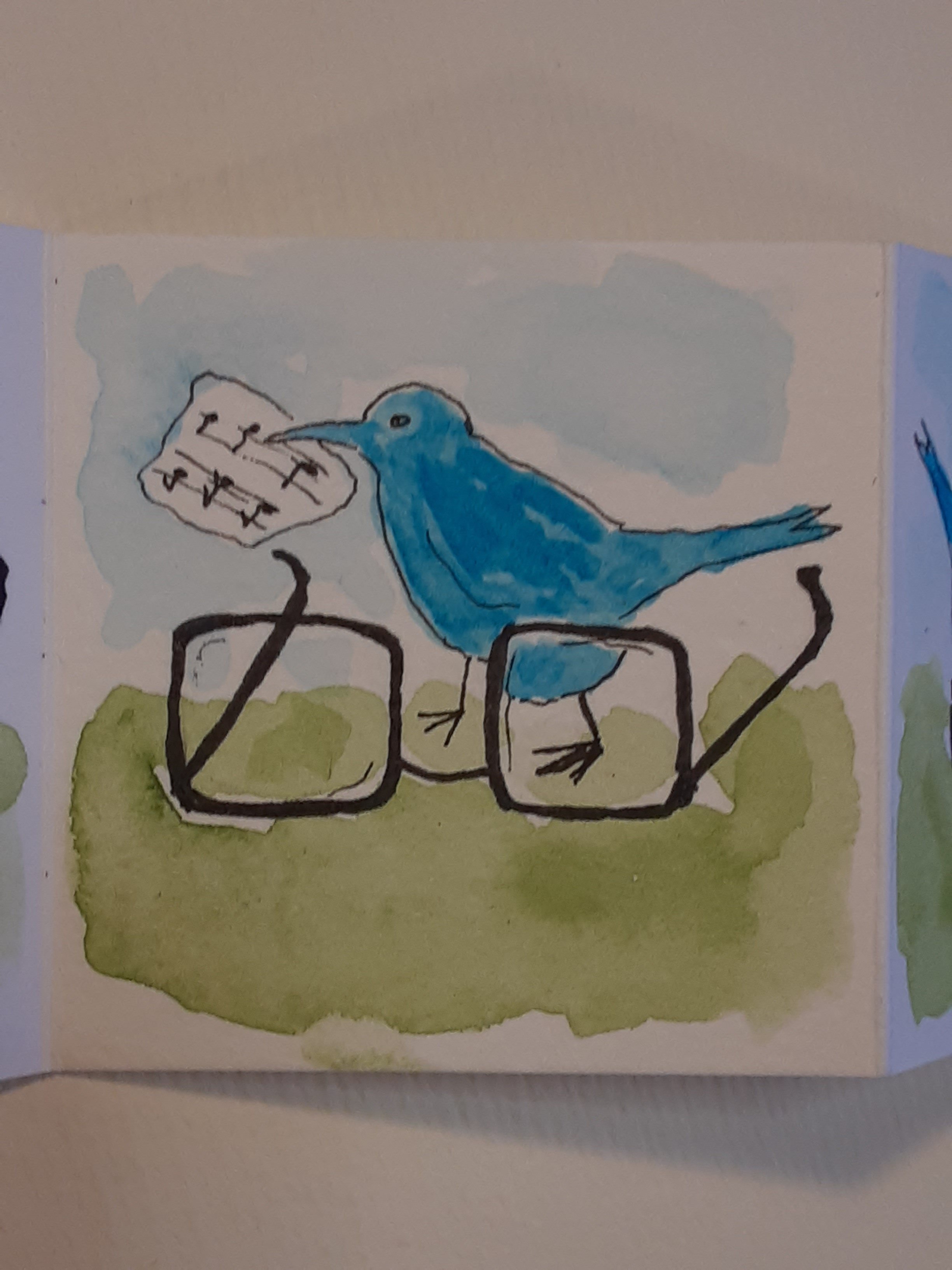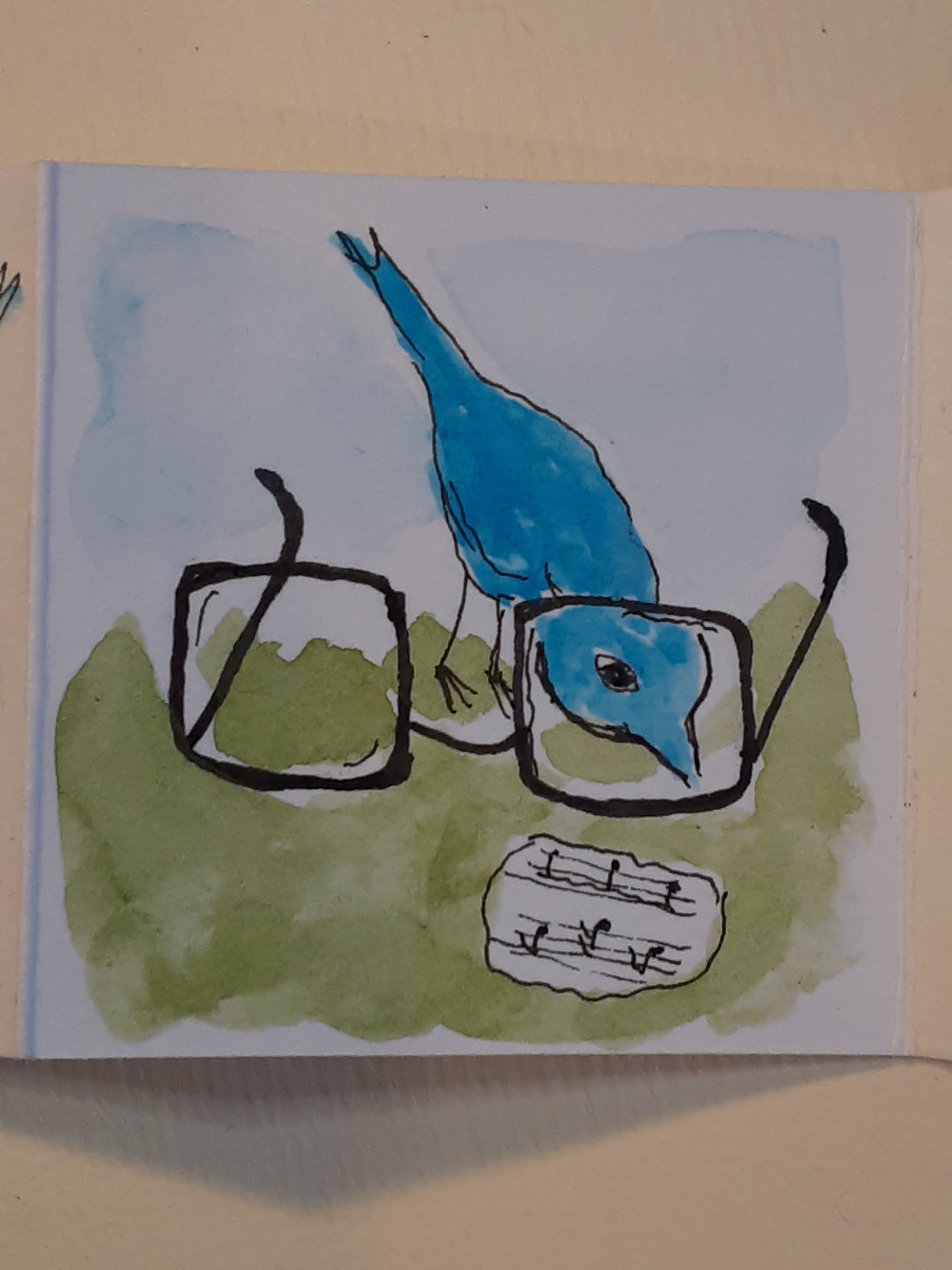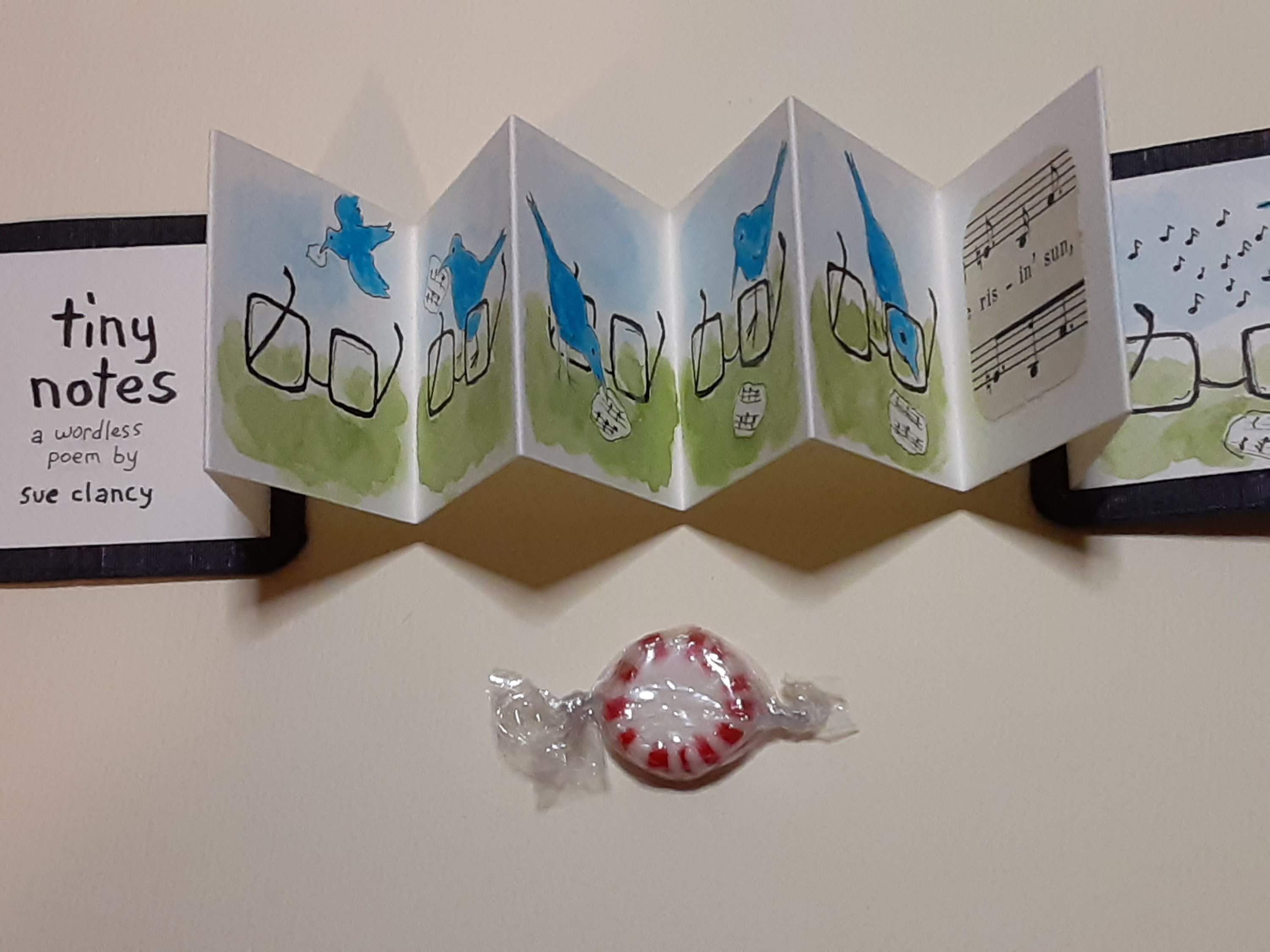 Oh my goodness, it took me a whole week to get to this post, and I’m so glad I saved it. What wonderful and fun projects. And I love the rabbit and dog approved – not to mention the Clancy wall – photos of your artworks reaching their destinations. The tiny notes poem is one of the most adorable things I’ve seen in a long time. I love the concept and the bird peeking through the glasses to sing the score is simply wonderful. Such a cool program to have a color-along for kids. A post that brought me even more smiles than you usually do, Sue… and that’s saying something!! 🙂