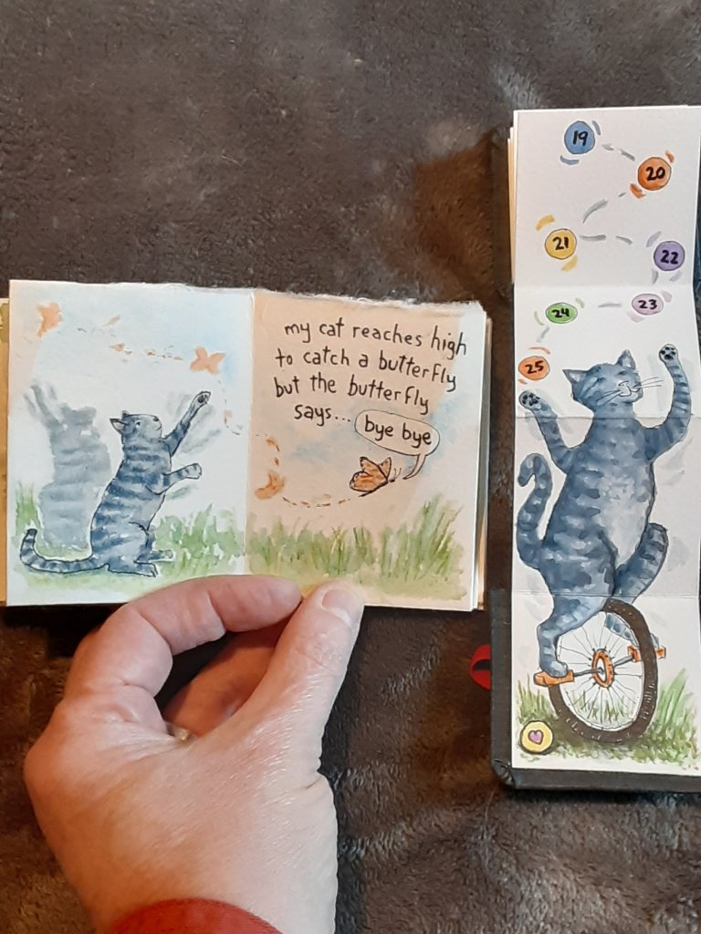 Part of curiosity, imagination and the life of the mind is allowing oneself to mentally reach, to play, to accept the risks and thrills of uncertainty. As a metaphor for these thoughts, as you may know from past posts, I’ve been thinking of the ways cats reach up. Here’s two in-progress artist books that have cats reaching in them. (Probably these books will eventually go to Storyberries.com)