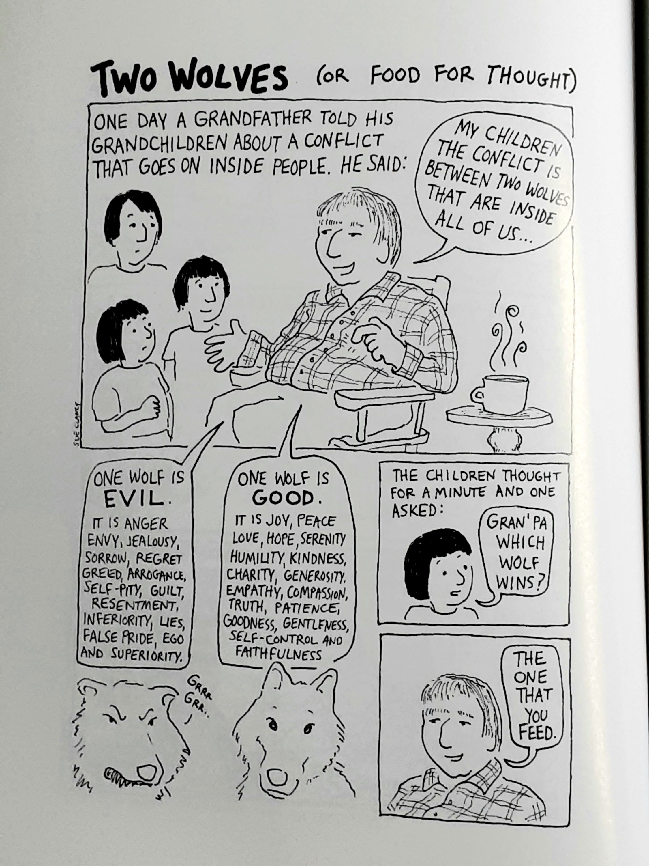 I also see a correlation to what Michael Graeme says in his blog here “Try to go deeper, into the sublime, and feel it.” We can choose what we focus on, we can fully experience our feelings (taking breaks as needed) and fully embrace whatever feeds our good wolves and let that in turn feed our creative souls.