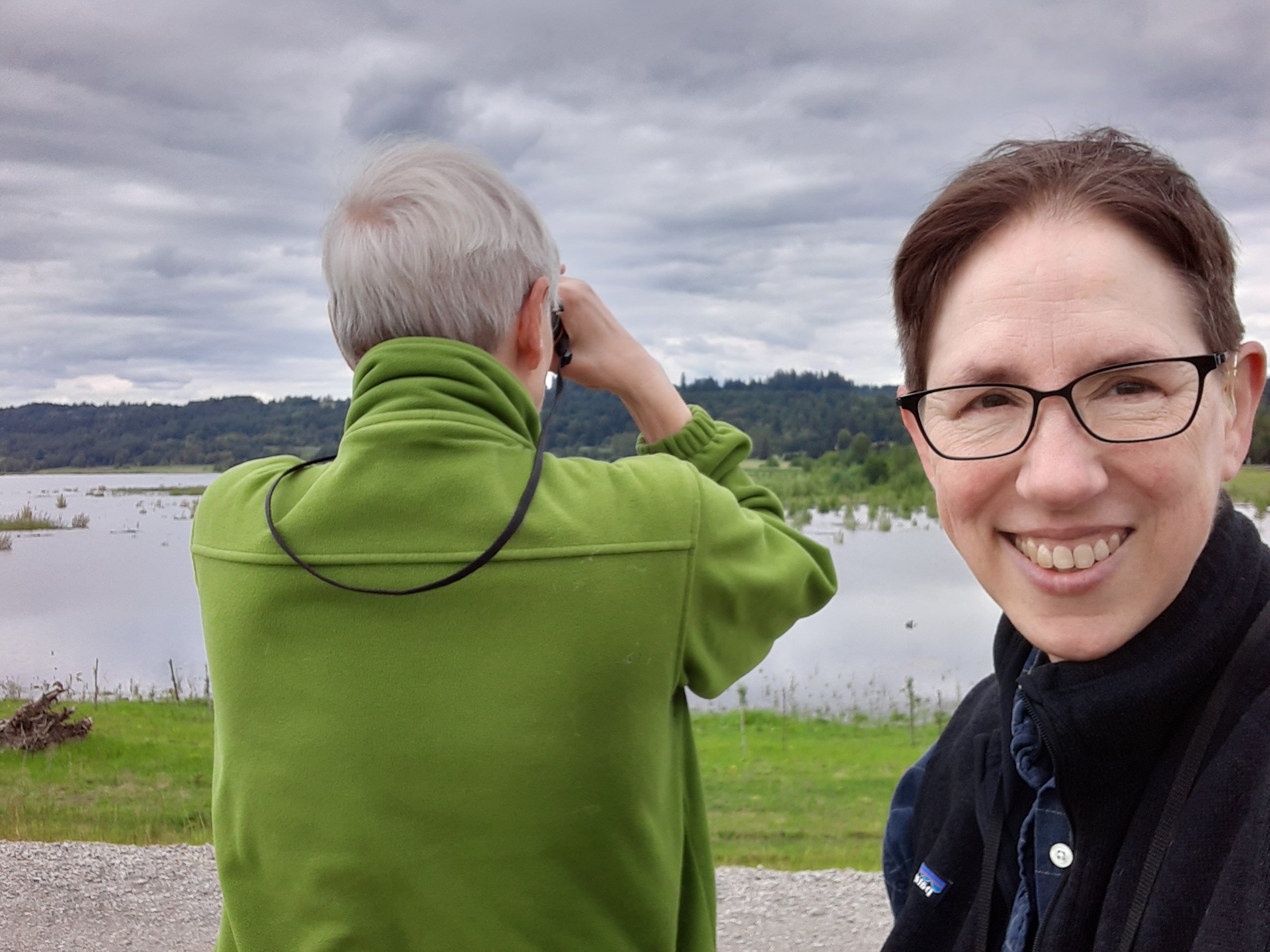 Besides musing about words my wife and I went for a walk in the Steigerwald Wildlife Refuge with our binoculars. I saw the purple blue grey colors of a great blue heron up close! I didn’t realize the extent of the purplish tints to the heron feathers.  We saw lots of other wildlife too – including smiling friendly humans!