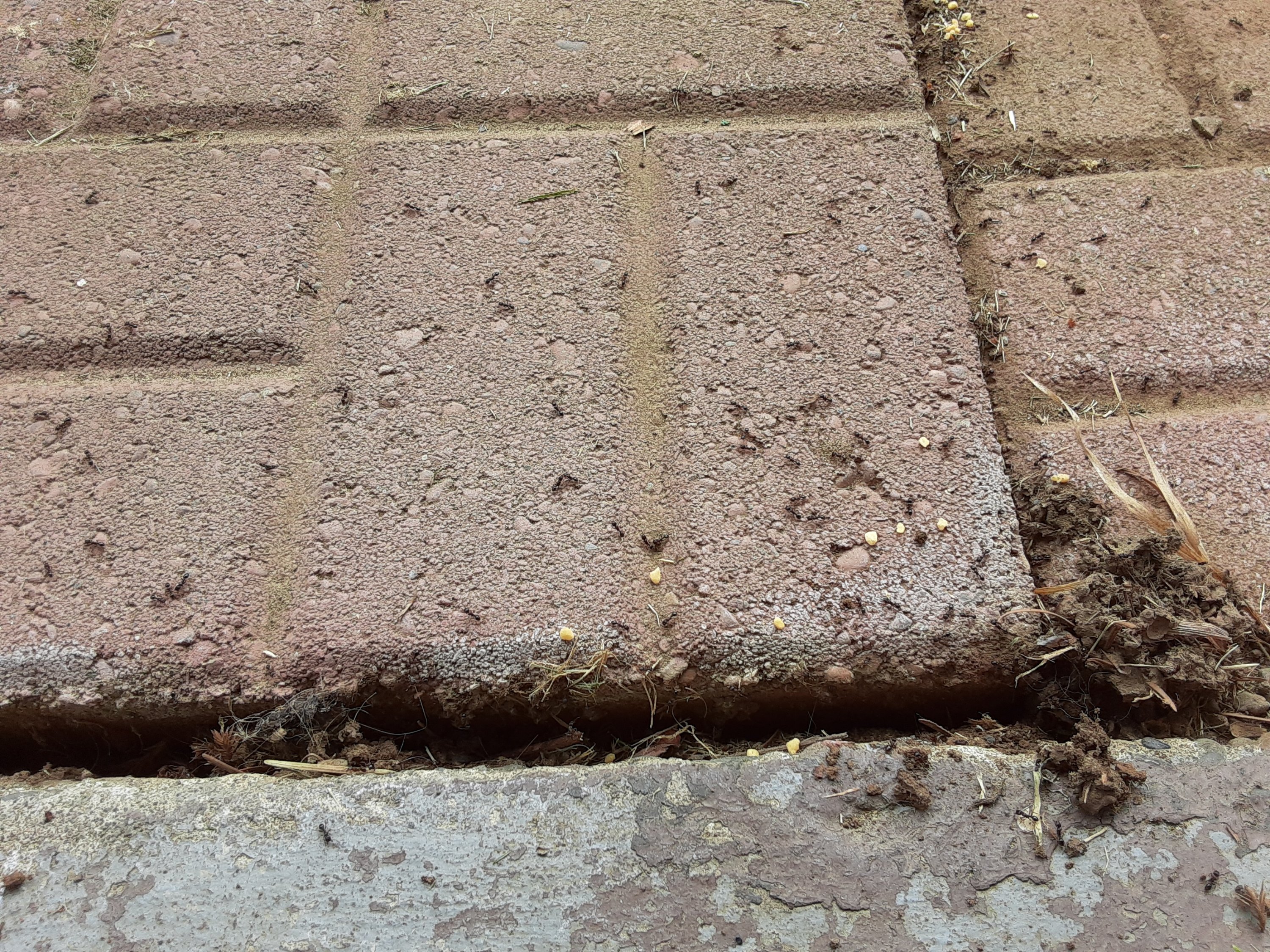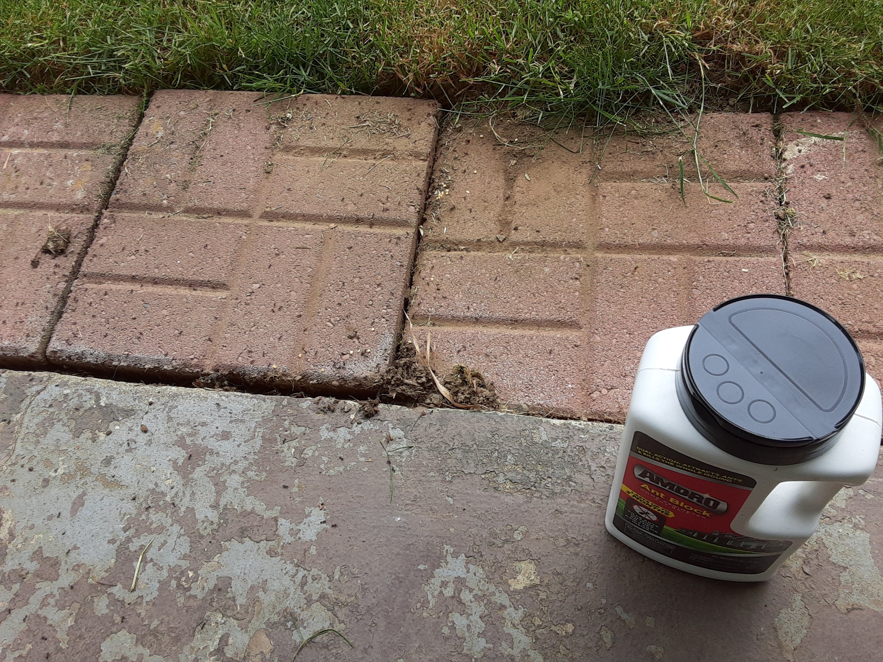 I lifted the bricks and put the ant bait directly on the fascinating ant farm-tunnel construction then covered the bait with the bricks again and swept away the dirt on the brick edges. Of course I had a good look at the way the ants collected and organized  the dirt before I did my acts of destruction.