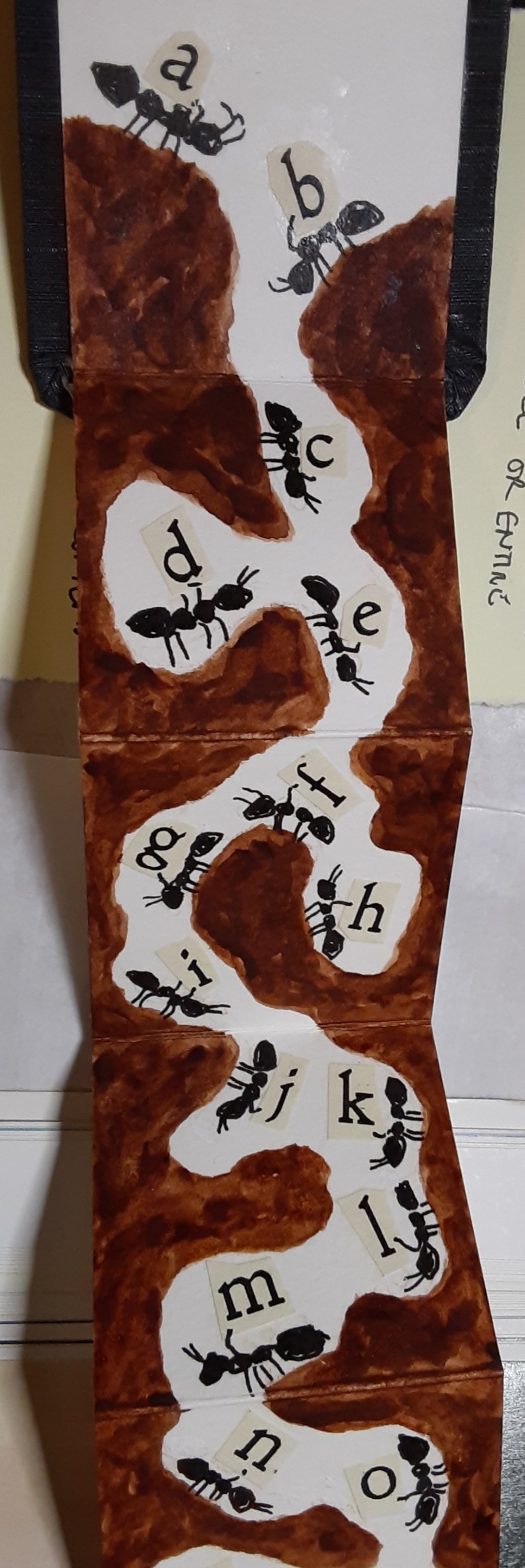 Ants are making progress… in my new artist book that is! In my last post I was working on “Ant Hology” using a collage of letters, ink and gouache. It’s another miniature 2 inch square book that opens to 20 inches long. Here’s the progress: