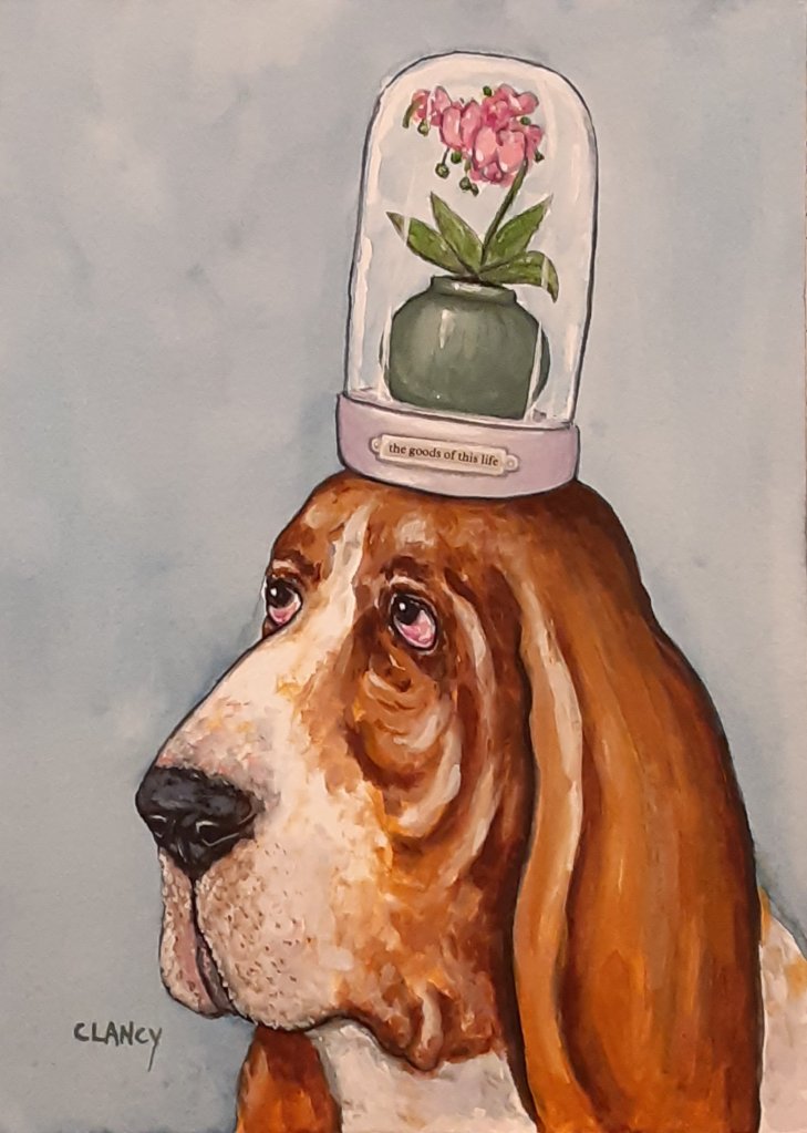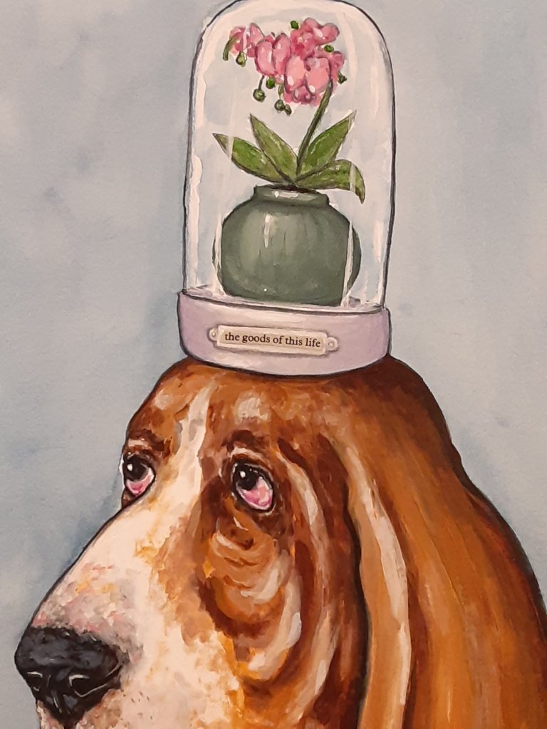 Painting. Basset Hounds. Flowers. I combined these favorites in a mixed media painting titled “The Goods Of This Life”. It’s 8 x 11 inches and was made using ink, color pencil, gouache and collage on board.