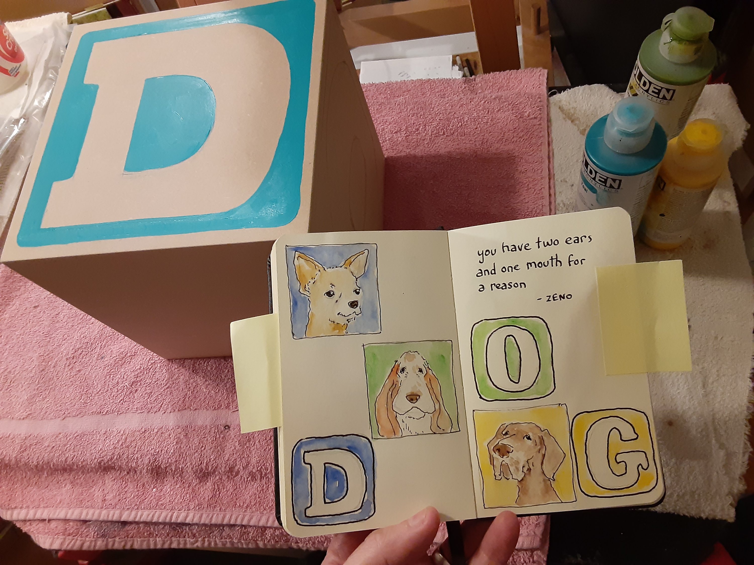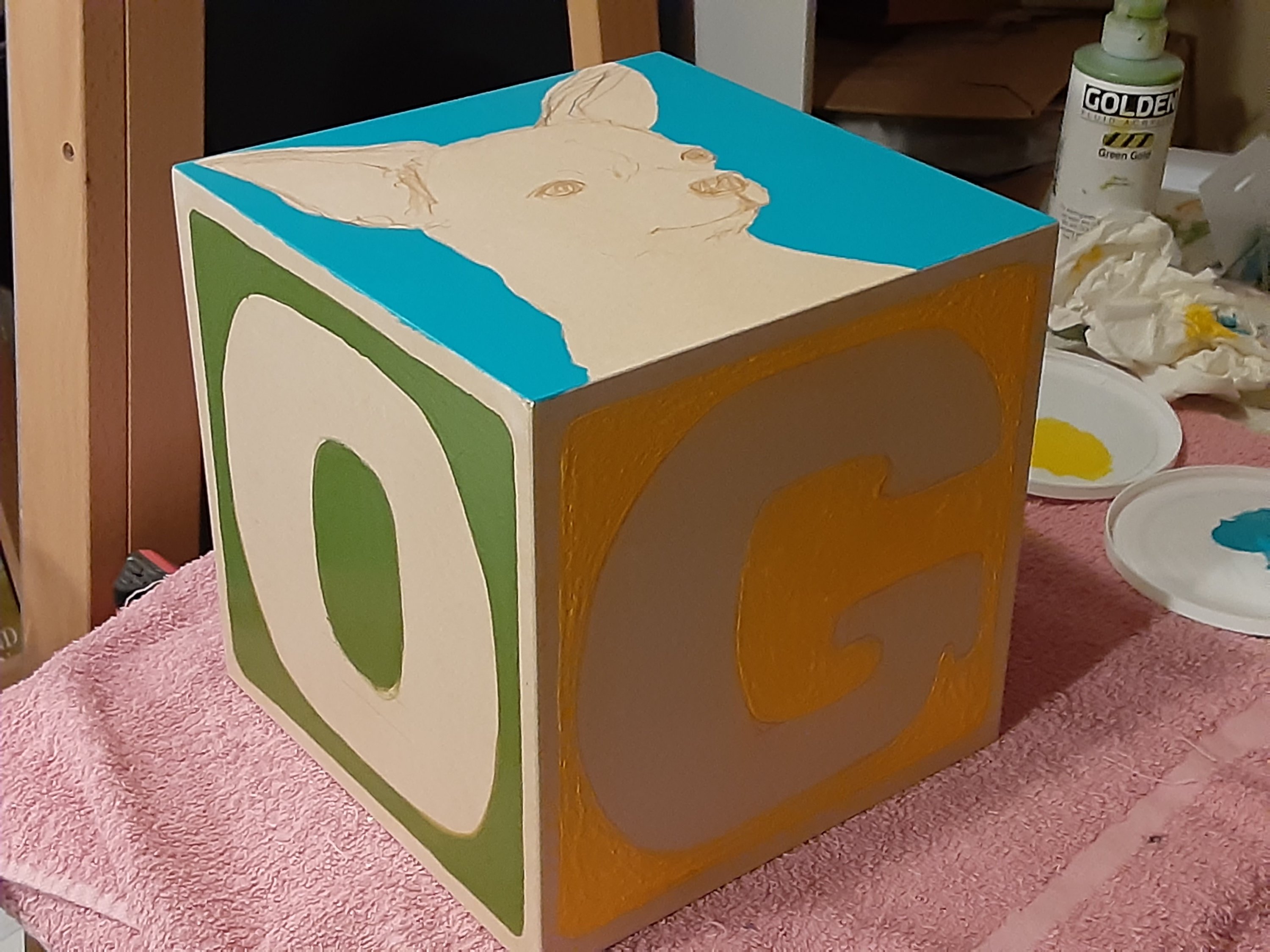 This project in progress below is a 3d cube 8 inches square that I’m doing for a holiday exhibit at Caplan Art Designs! I’m aiming for the used wooden toy block look – but with a dog theme.