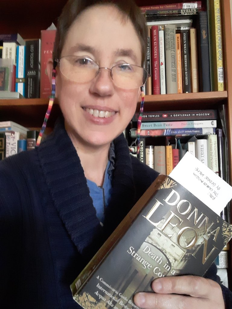 I read a lot, mostly Donna Leon mystery novels as I love those! Hearing is no issue when reading a book! Reading books was how I dealt with being a deaf child too! Here’s a picture of hearing-aid-less me in front of my books to cheer up by shelves (details here)