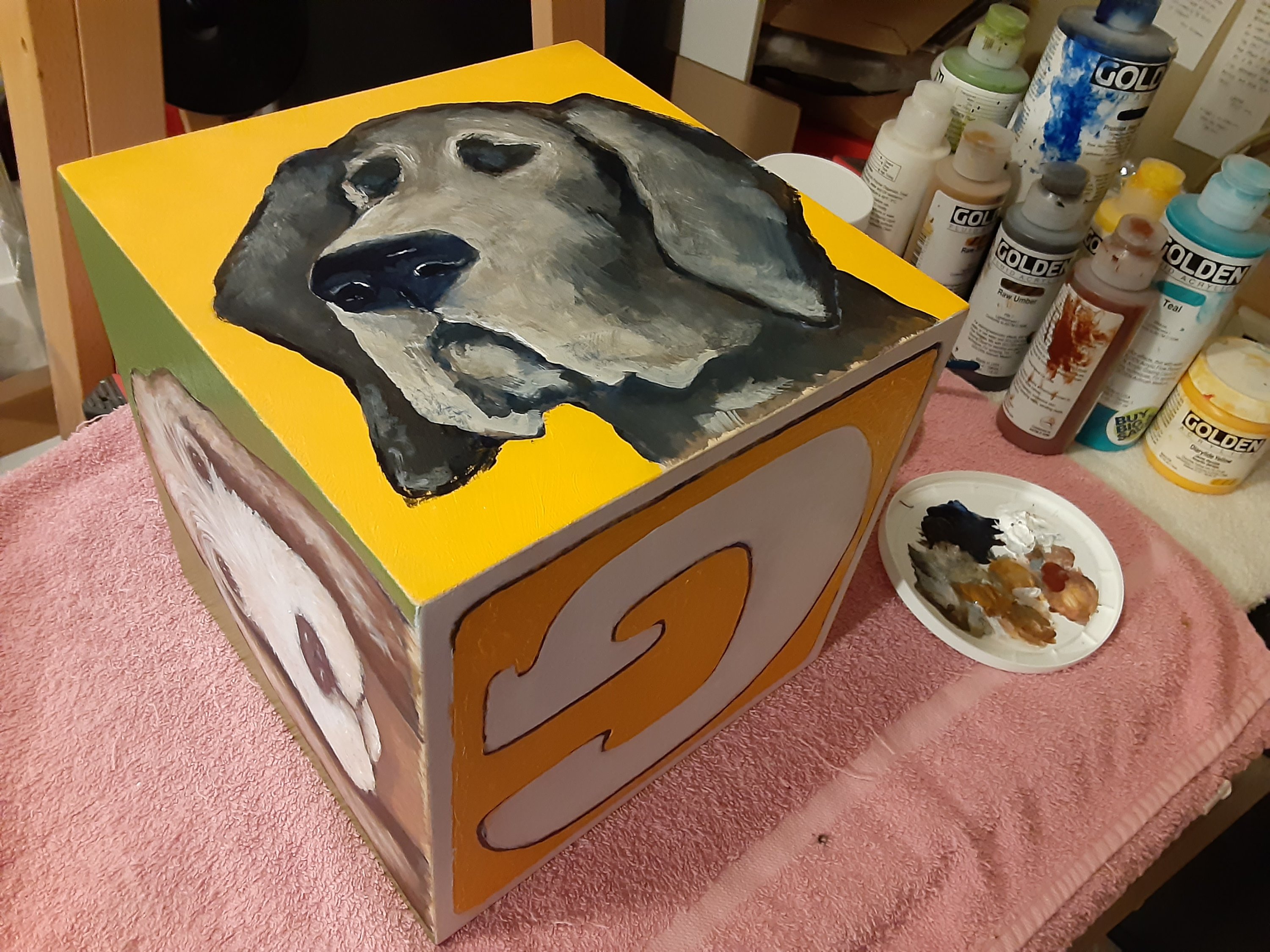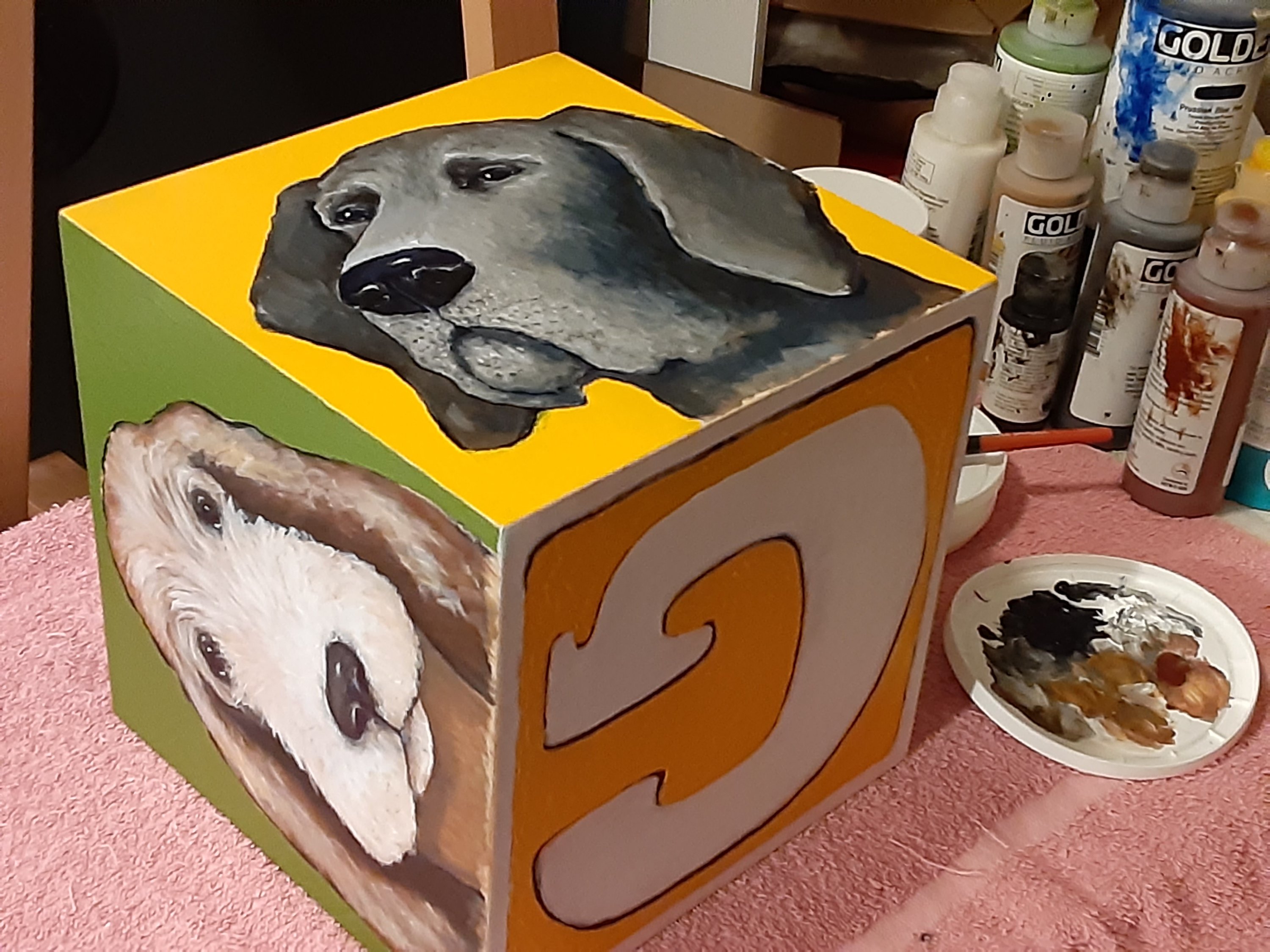 I think the pet photos paired with your paintings is a wonderful thing! And I absolutely love the 3D box, especially the fact it is so sturdy and could be sat upon by children. They can interact with the block and the artwork images in a unique way.