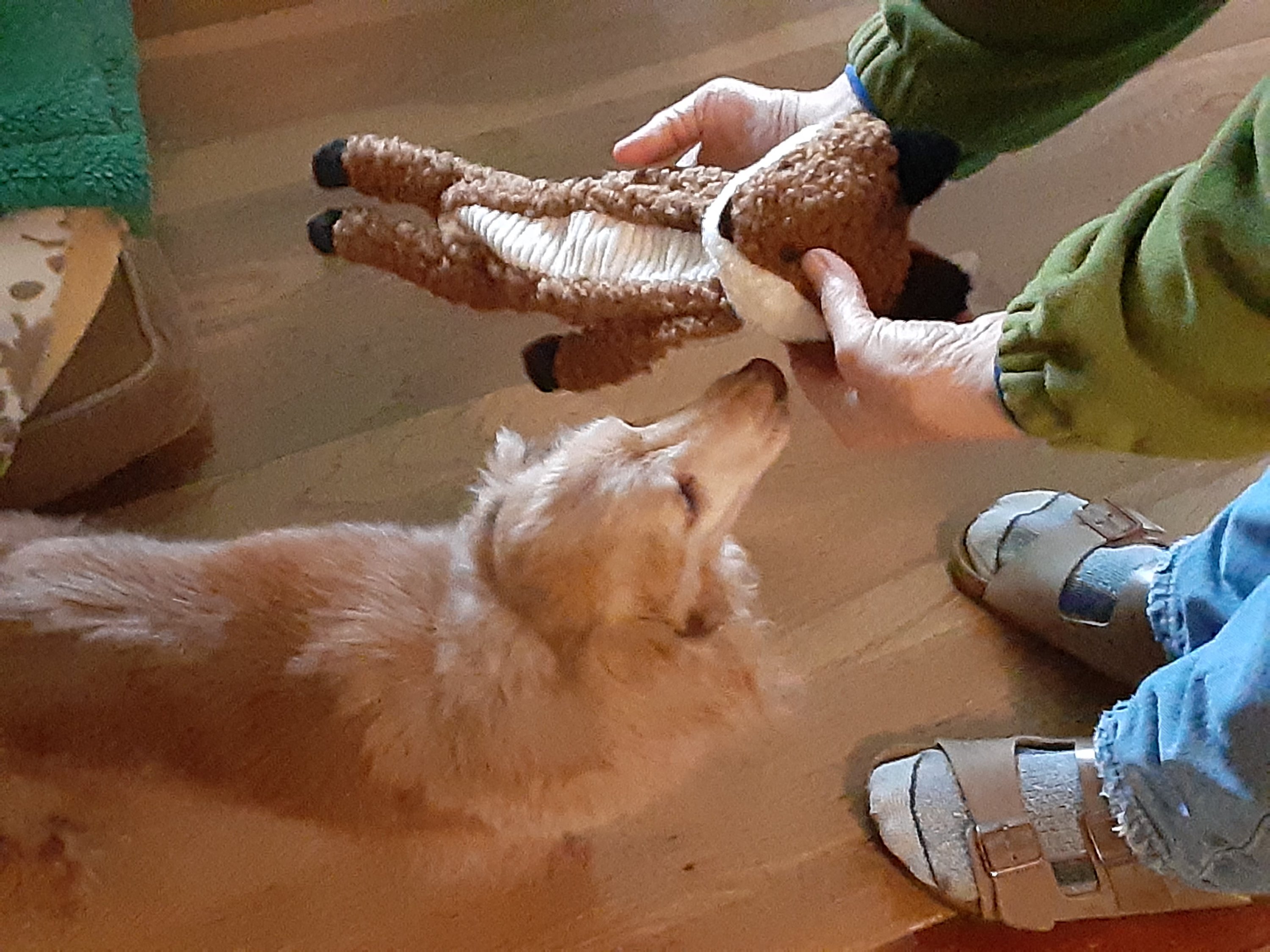 Rusty loves his new toy! First he checked to make sure it didn’t have much stuffing. Here’s my wife demonstrating that the new toy is flat and floppy as per his preference. Once that prerequisite was shown Rusty loved it!