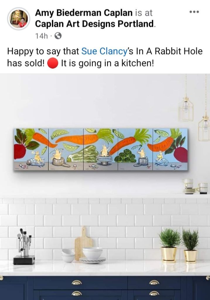 In 2023 I did a 5 panel painting “In The Rabbit Hole” and the Caplan Art Designs Gallery has recently sold it to a collector who is putting it in a kitchen!