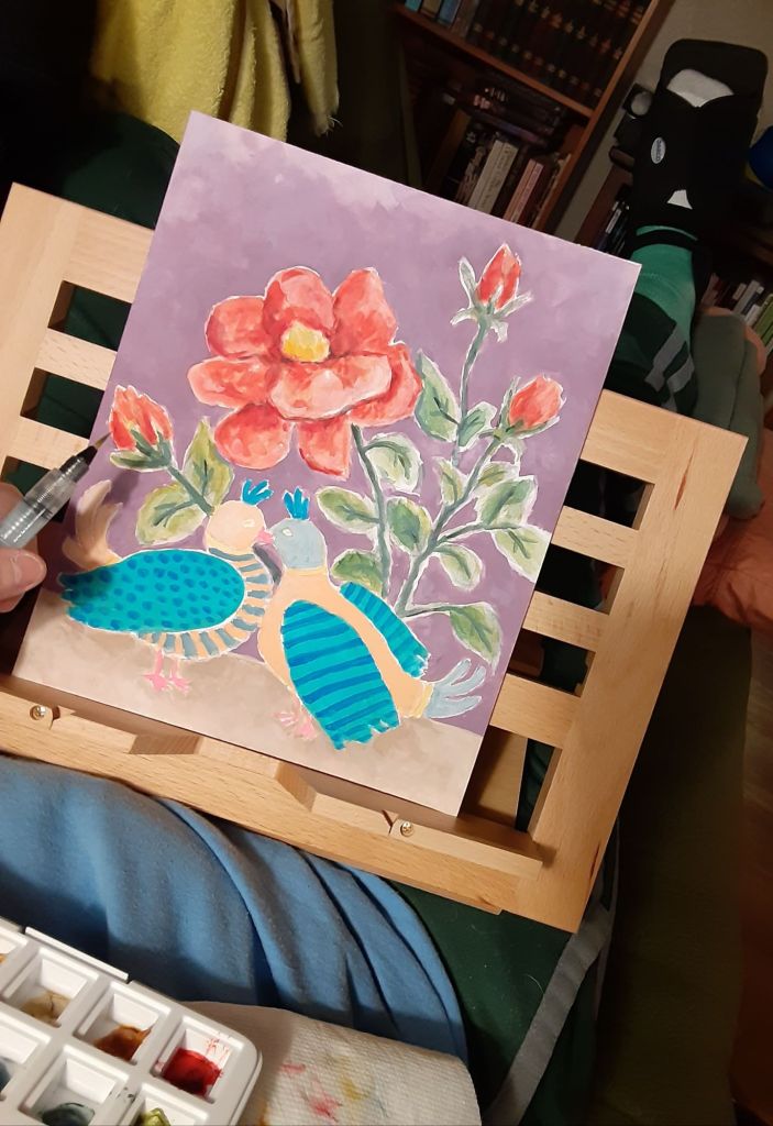 So with the help of my wife I’ve begun to put a small easel on my tummy in order to paint while laying on the couch with my foot up on several pillows and a folded blanket. She kindly fetches my paints and washes up my brushes. Together we’re making it work… I think.