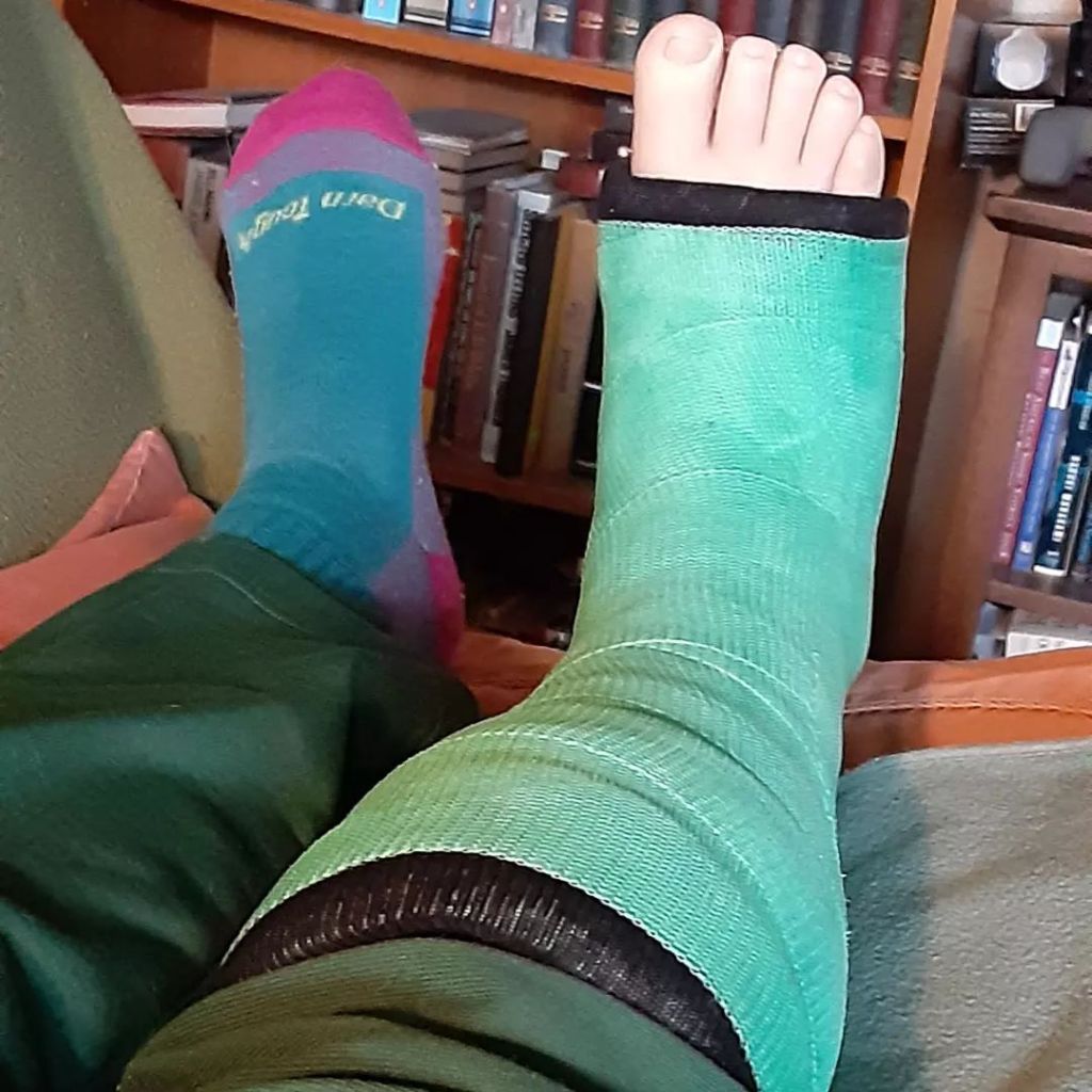 … but since taking the above photo I visited my doctor, got a new cast and a firm talking-to about the meanings of “elevating” a foot and “resting”.