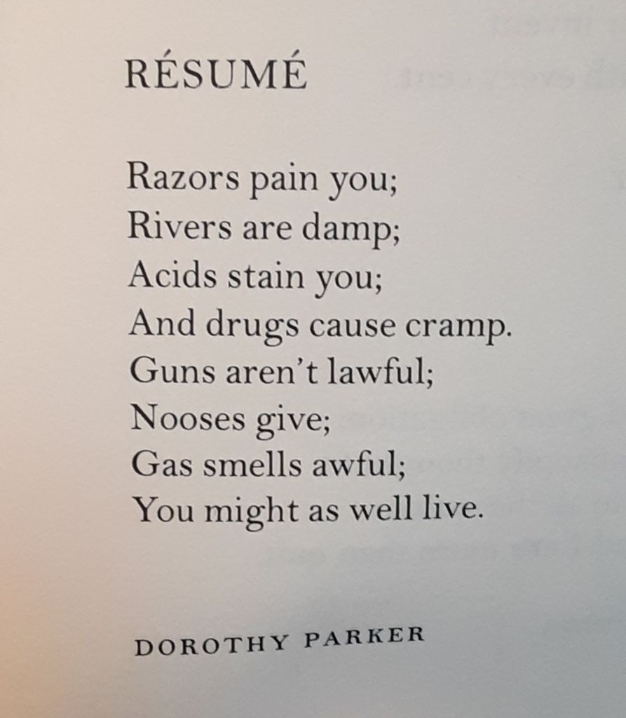 Here’s my current favorite poem by Dorothy Parker. It’s one of the poems I’m memorizing and thinking about when I’m getting up too dang early to go to physical therapy or the doctor’s for my hurt-but-healing ankle.