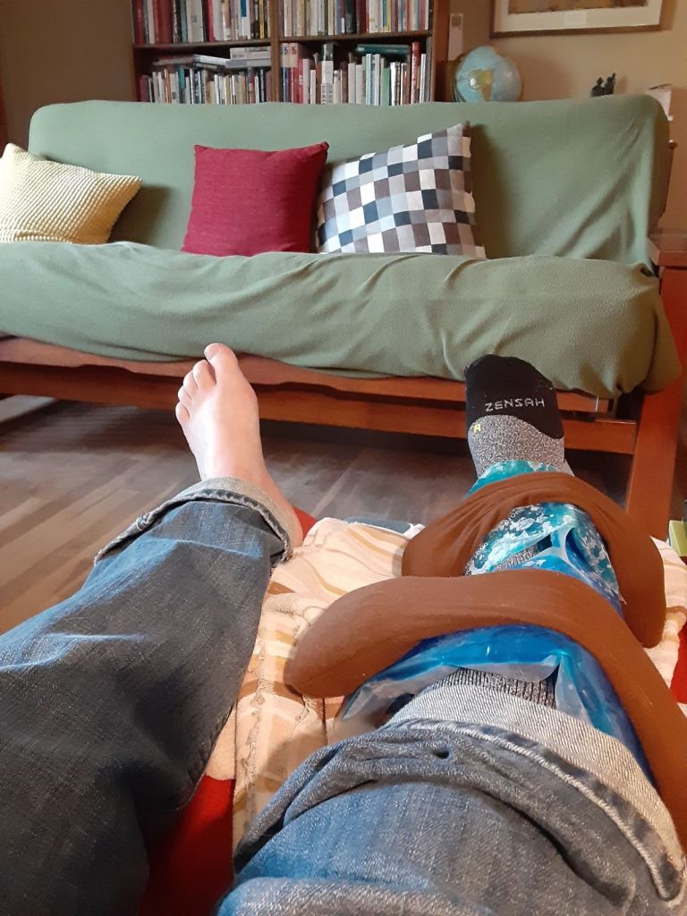 And here’s a selfie of me the day after the opening keeping my still in physical therapy ankle on ice!