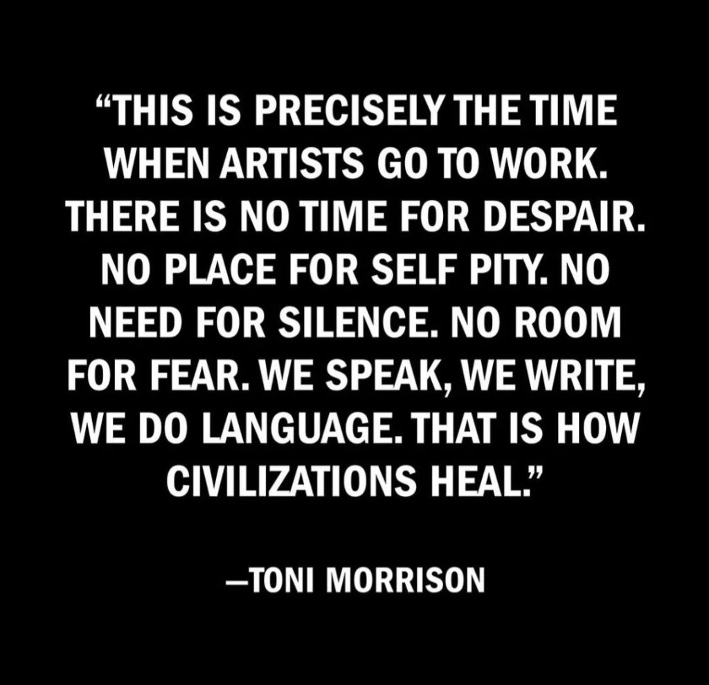 If you’re an artist or creative – please keep going, keep creating! If you don’t consider yourself artistic, please, comment kindly, or don’t comment at all, whenever you see creativity from an artist. And if you can afford it please buy from local artists and local art galleries and local bookstores and local independent theaters and local restaurants…. we need you and you need us because we’re all part of humanity. (See also the quote below by Toni Morrison)