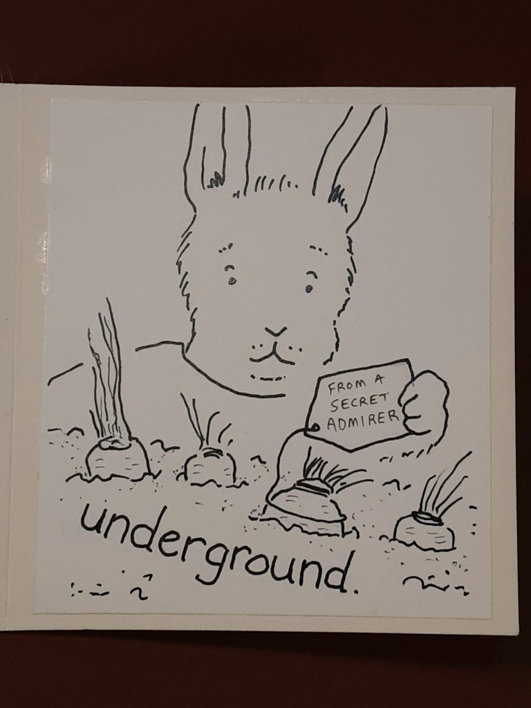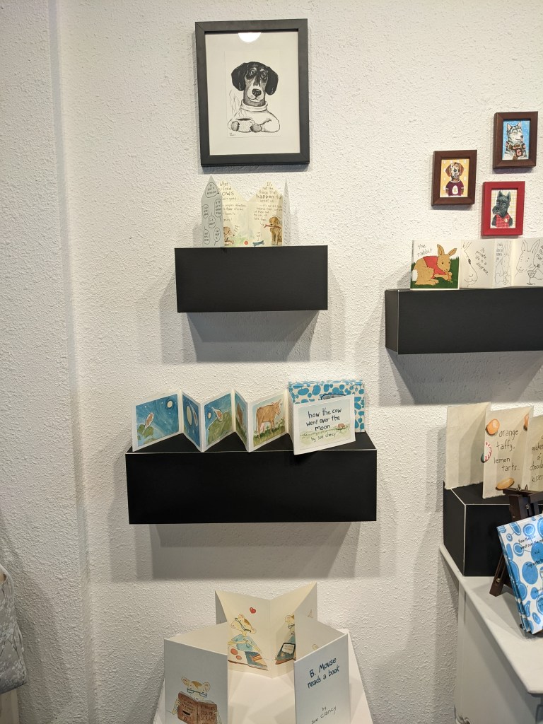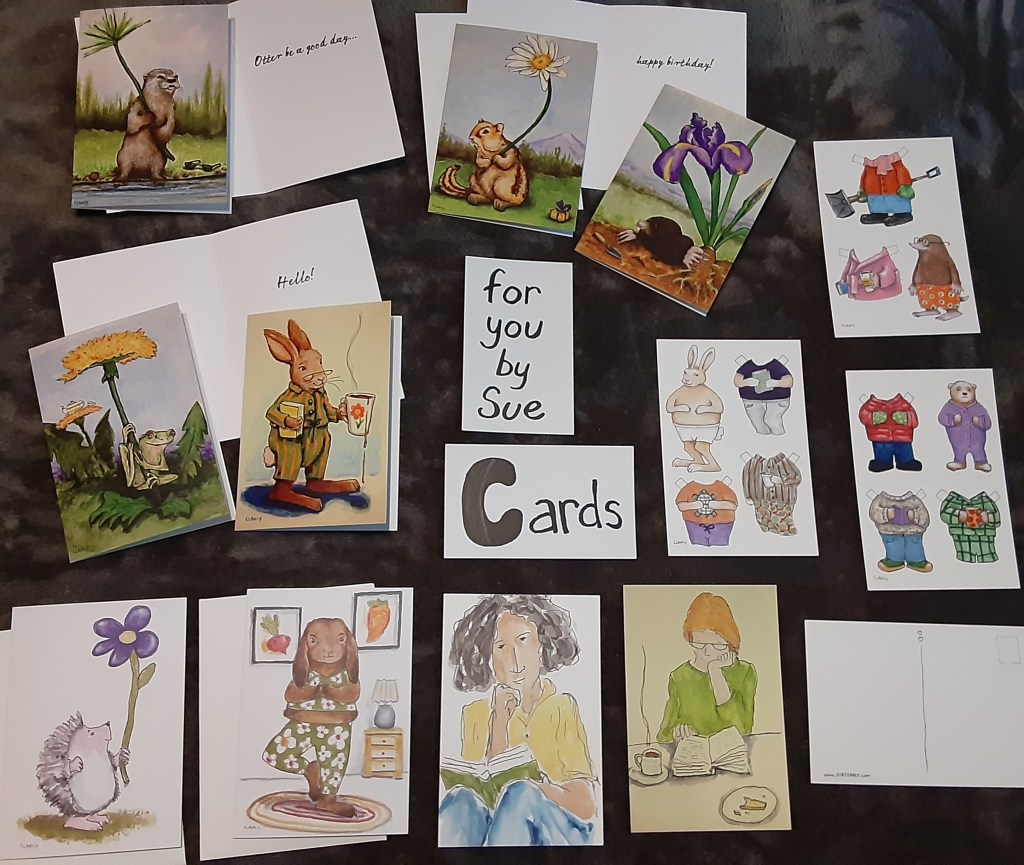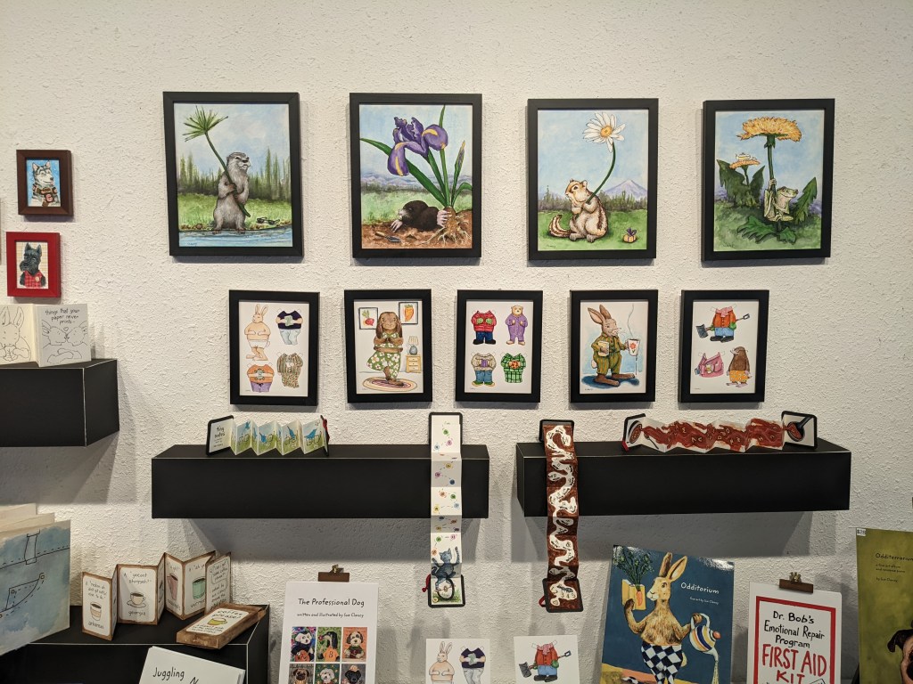 About the exhibit Sue says: “I see creativity as a very practical thing. Art adorns our walls. Books bemuse us. Cards connect us. For this exhibit I include all three of these essential elements of life because it’s been stressful lately and I am me. So I made these things for you.”