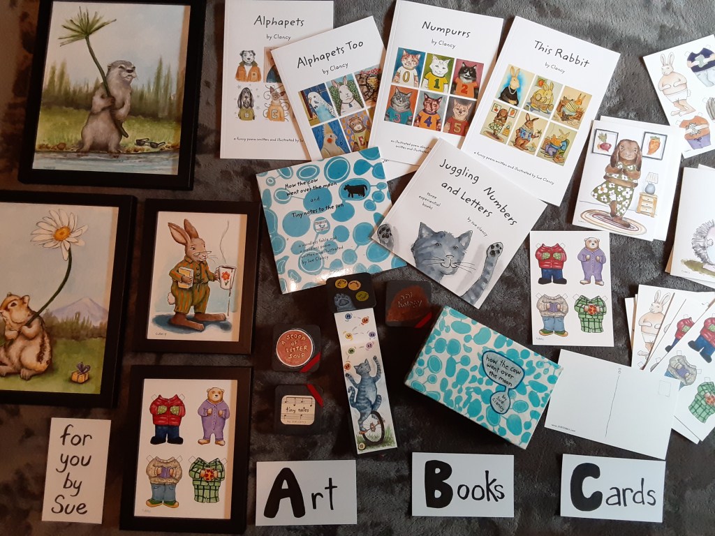 Sue Clancy is having a one person art exhibit at the Aurora Gallery titled “For You by Sue the ABC’s: Art, Books, Cards”. The photo above and the video below shows a small selection of over 30 related art objects created by Sue that are available.