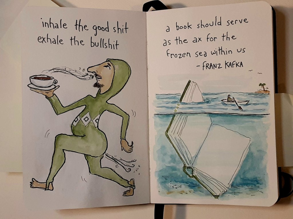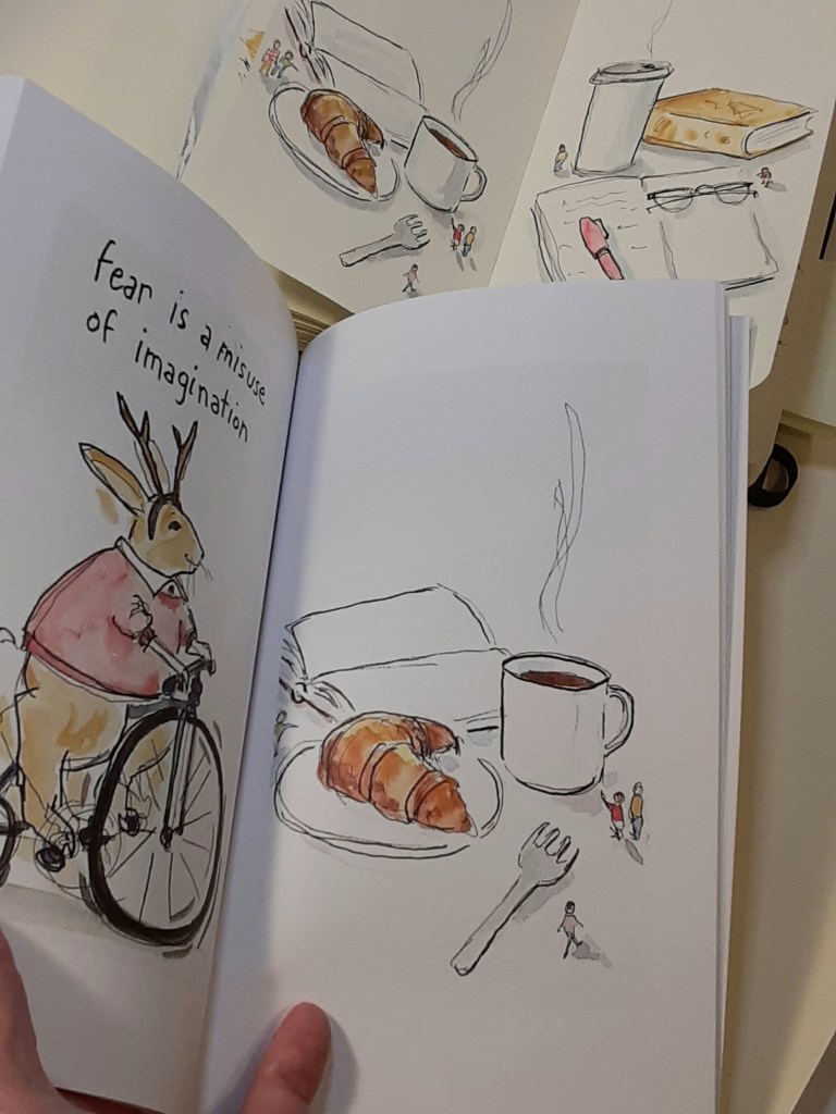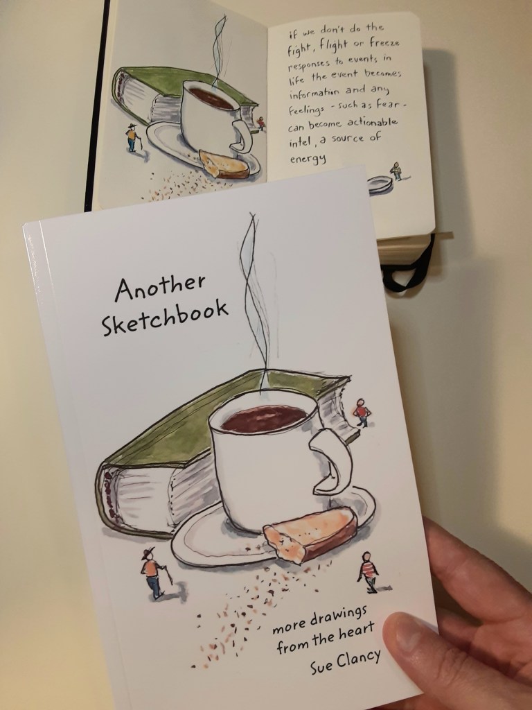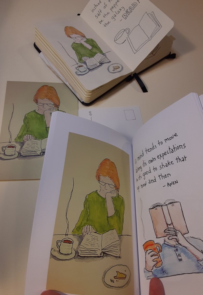 Another Sketchbook – is a printed reproduction of Clancy’s sketchbook about reading books and nurturing an inner life. There are postcards available of pages from this book at the Gallery too.