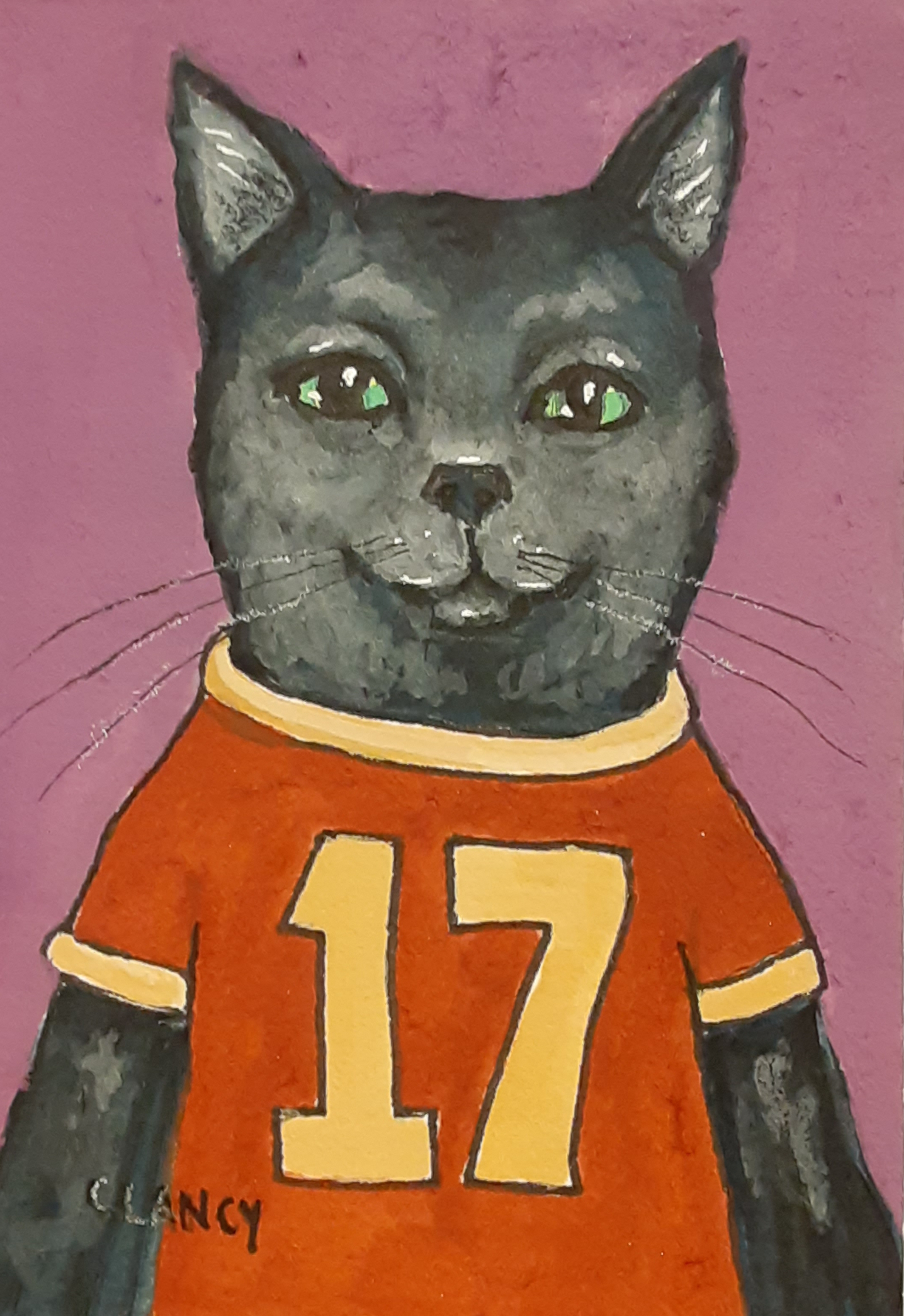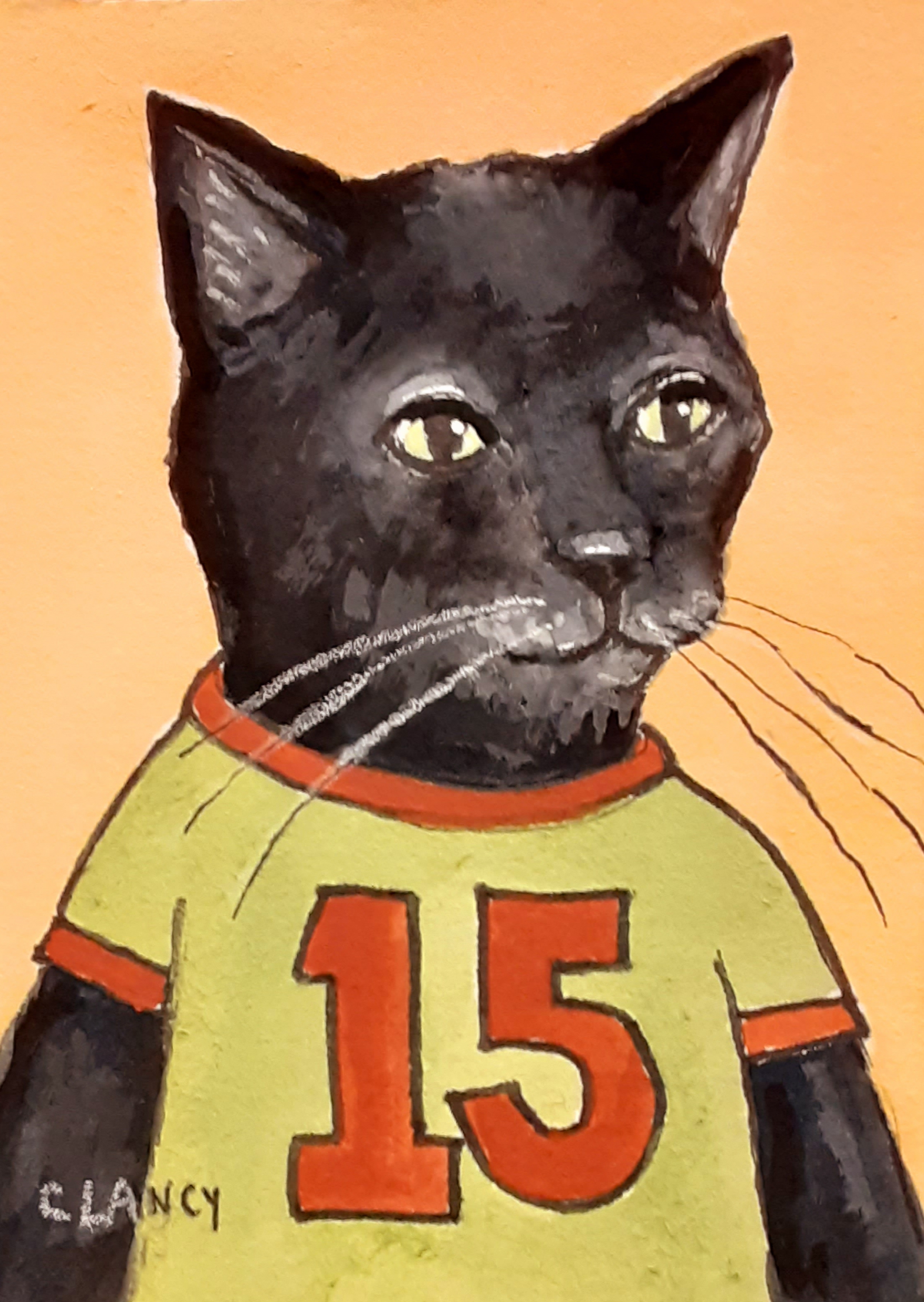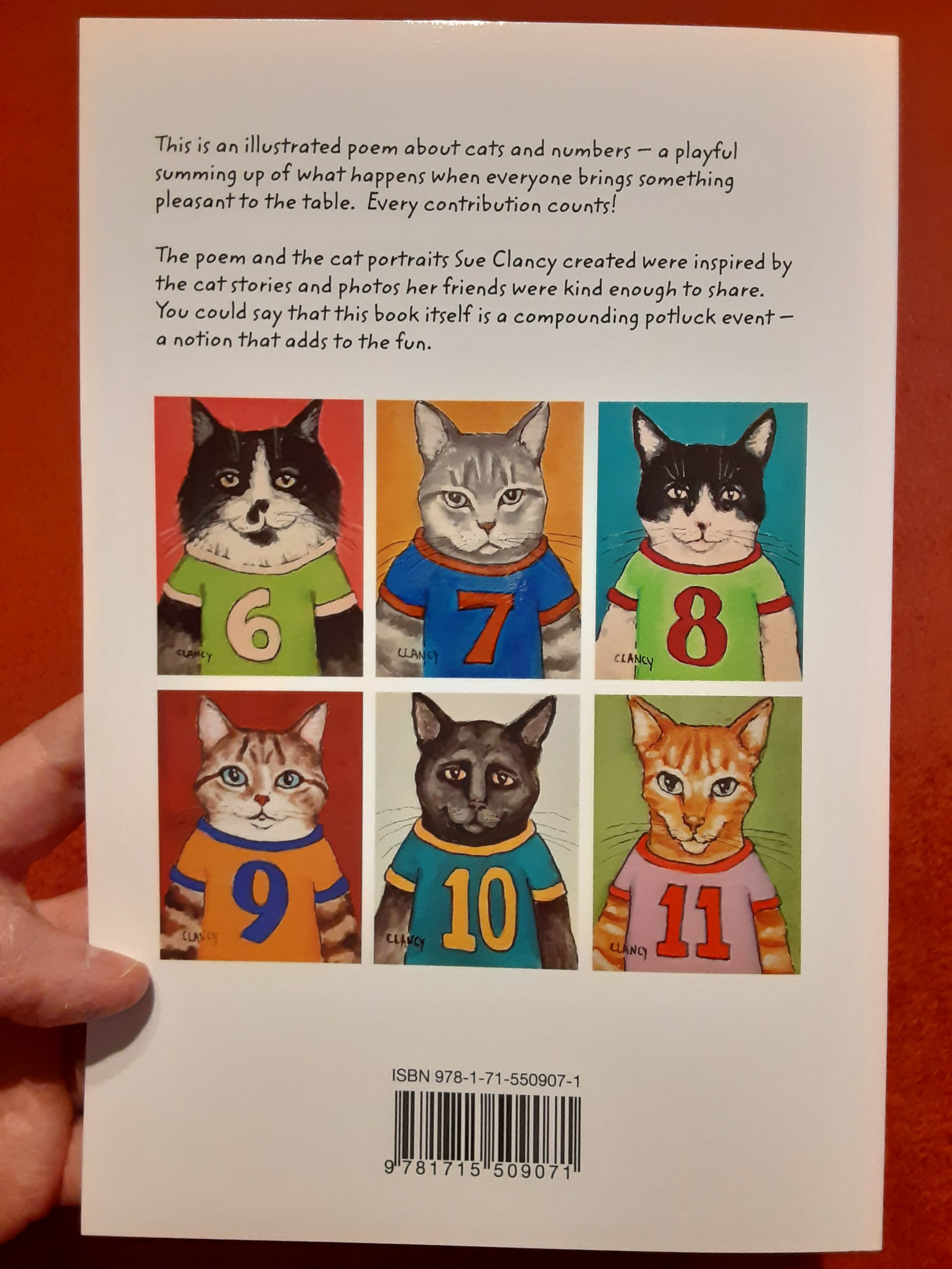 Both the poem and the cat portraits Sue Clancy created were inspired by the cat stories and photos her friends were kind enough to share. You could say that this book itself is a compounding potluck event โ a notion that adds to the fun.