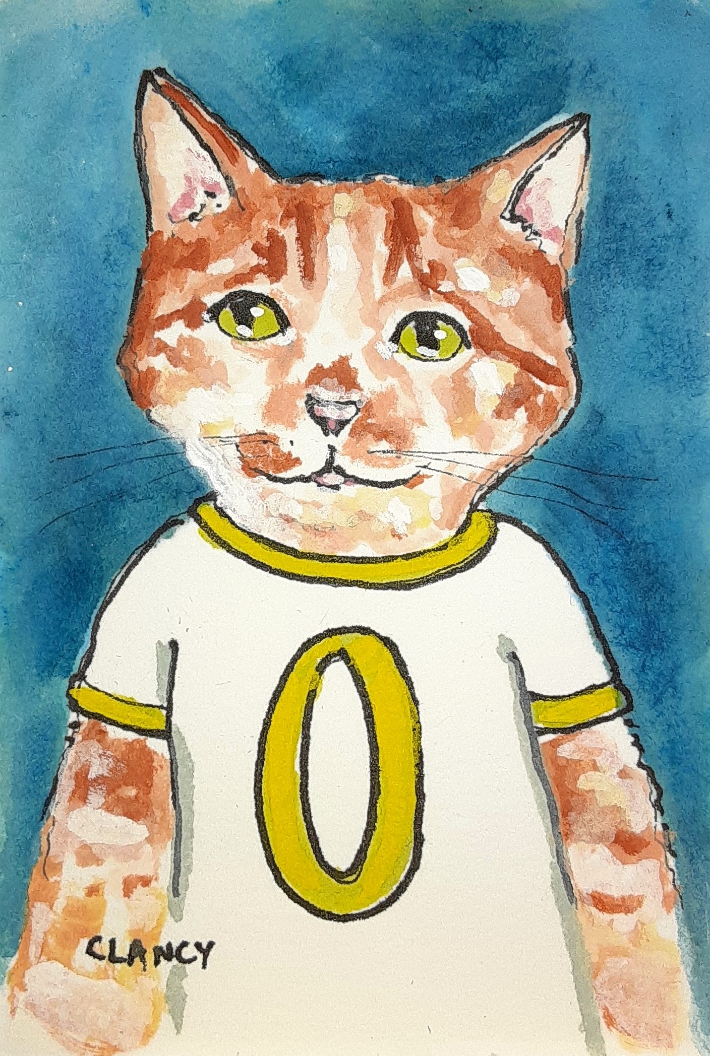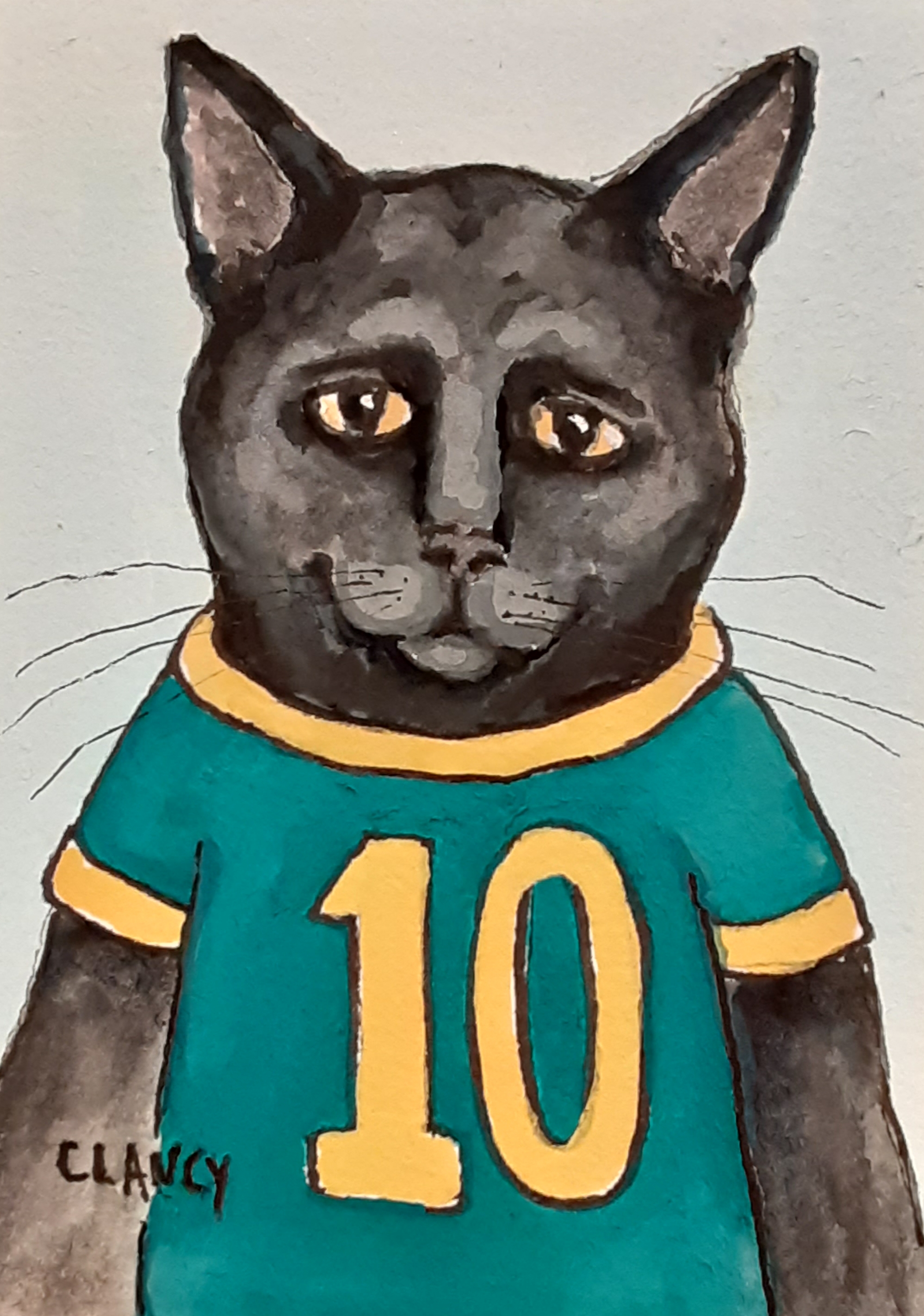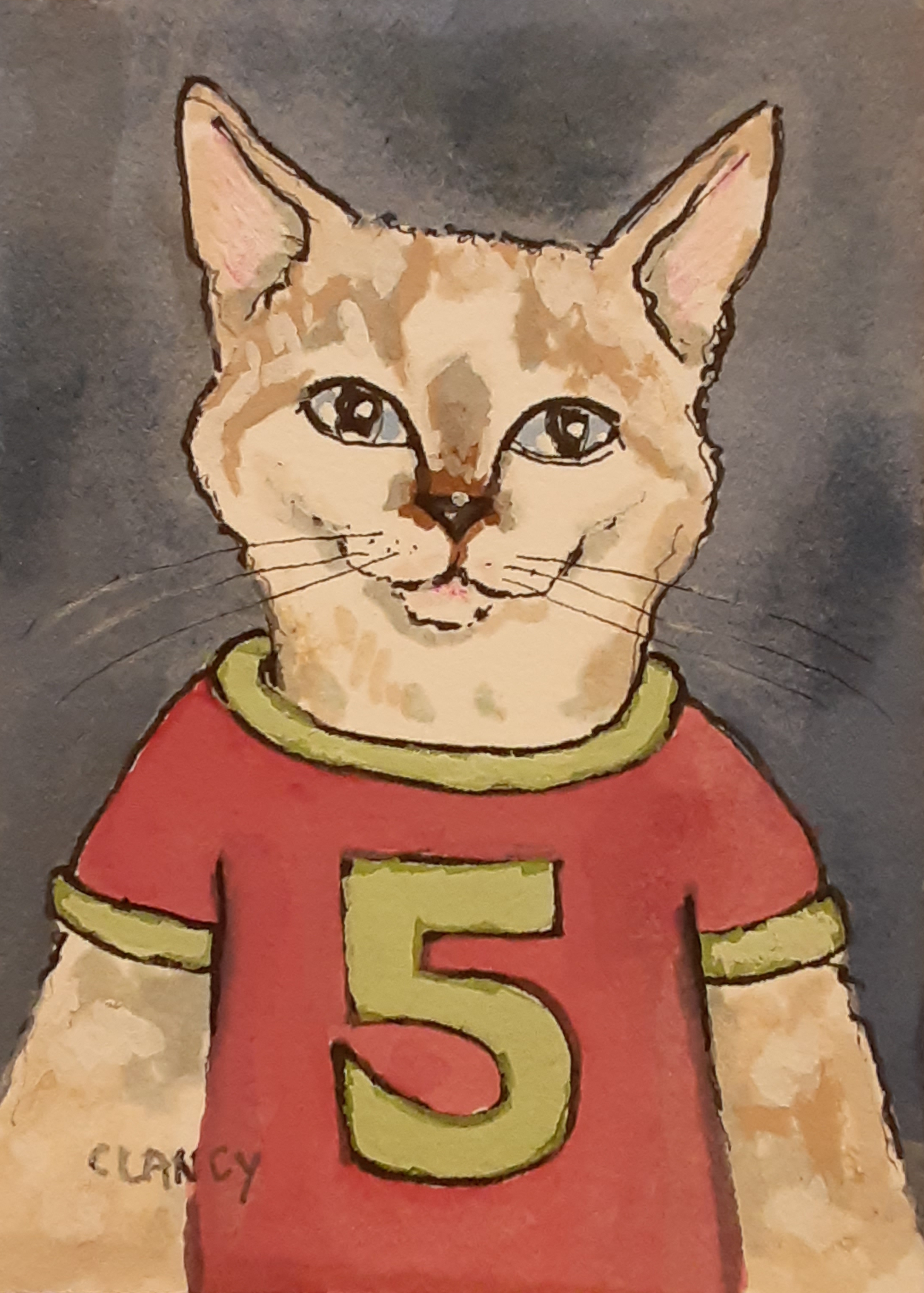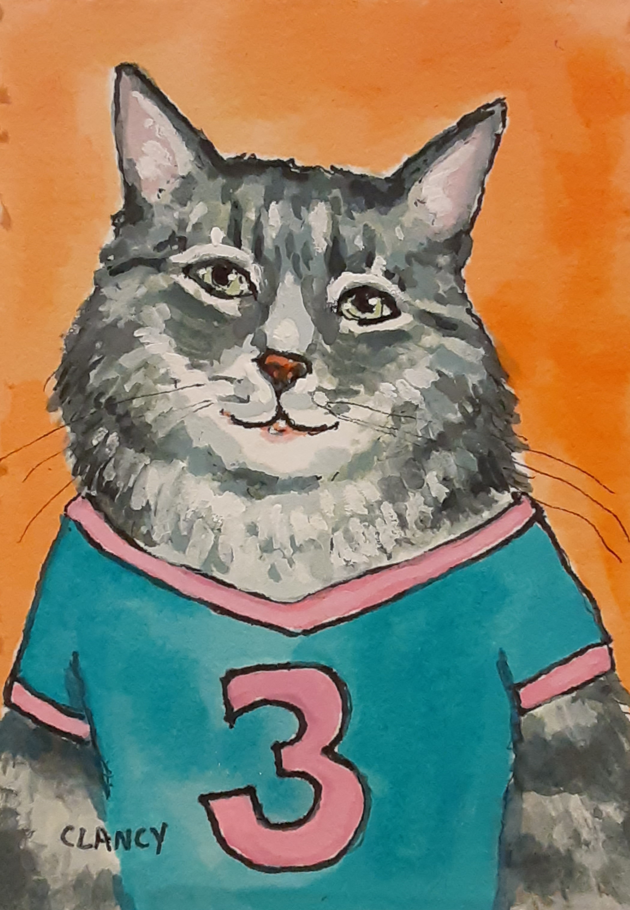 Both the poem and the cat portraits Sue Clancy created were inspired by the cat stories and photos her friends were kind enough to share. You could say that this book itself is a compounding potluck event โ a notion that adds to the fun.